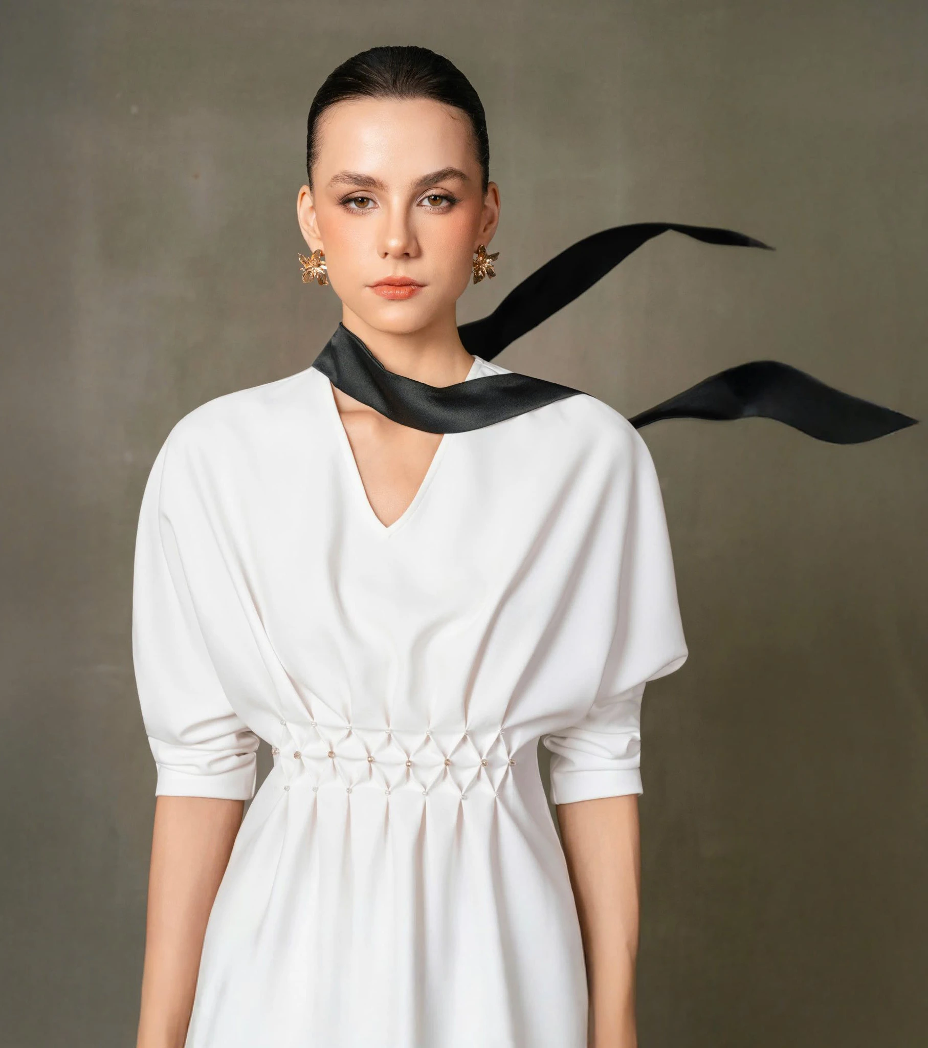 Một chiếc váy trắng tối giản, hiện đại qua chi tiết drapping nơi eo đủ sức giúp nàng trở nên nổi bật và cuốn hút. Phụ kiện thời trang, giày hoặc túi, trang sức có thể chọn phối khác màu để tạo thêm điểm nhấn cho bản phối