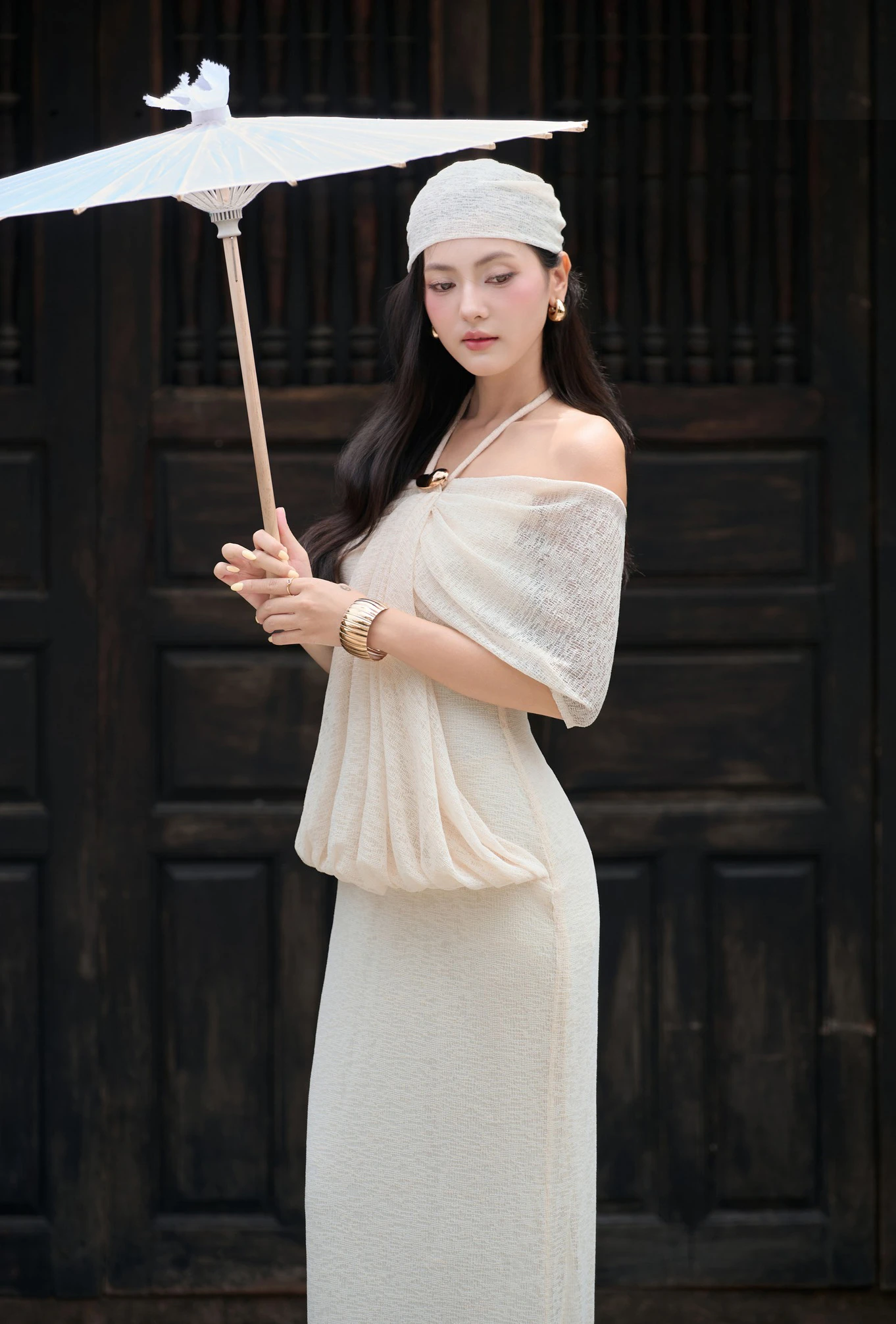 Thiết kế đầm màu trắng kem làm từ chất liệu thun lưới dáng midi với điểm nhấn trễ vai và chi tiết nhún xếp ở thân trước. Dự tiệc hay dạo phố cùng đầm vải tơ cấu trúc cổ lọ, thân nhún xếp với phần tùng váy tạo hình như mũ nấm