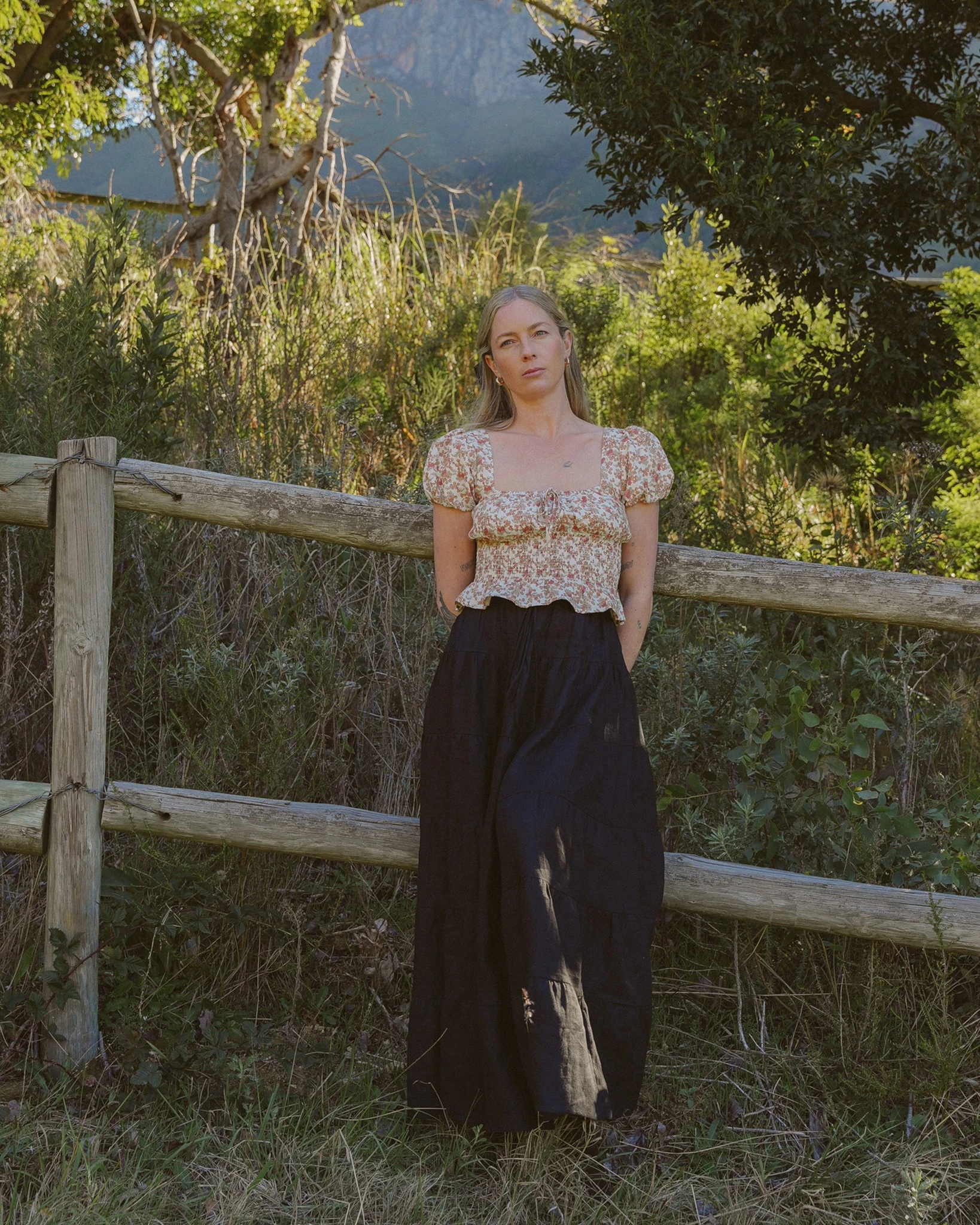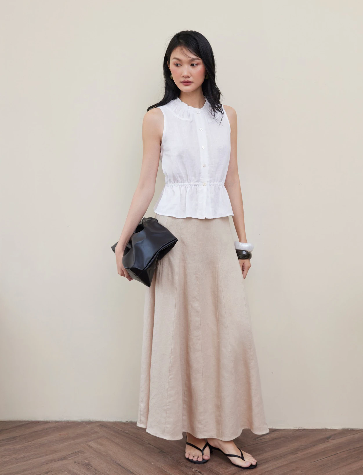 Áo hai dây linen tạo điểm nhấn bằng đường gấp nếp, kết hợp chân váy đồng điệu mang đến bản phối thư thái và nhẹ nhàng . ẢNH: THE SÓNG