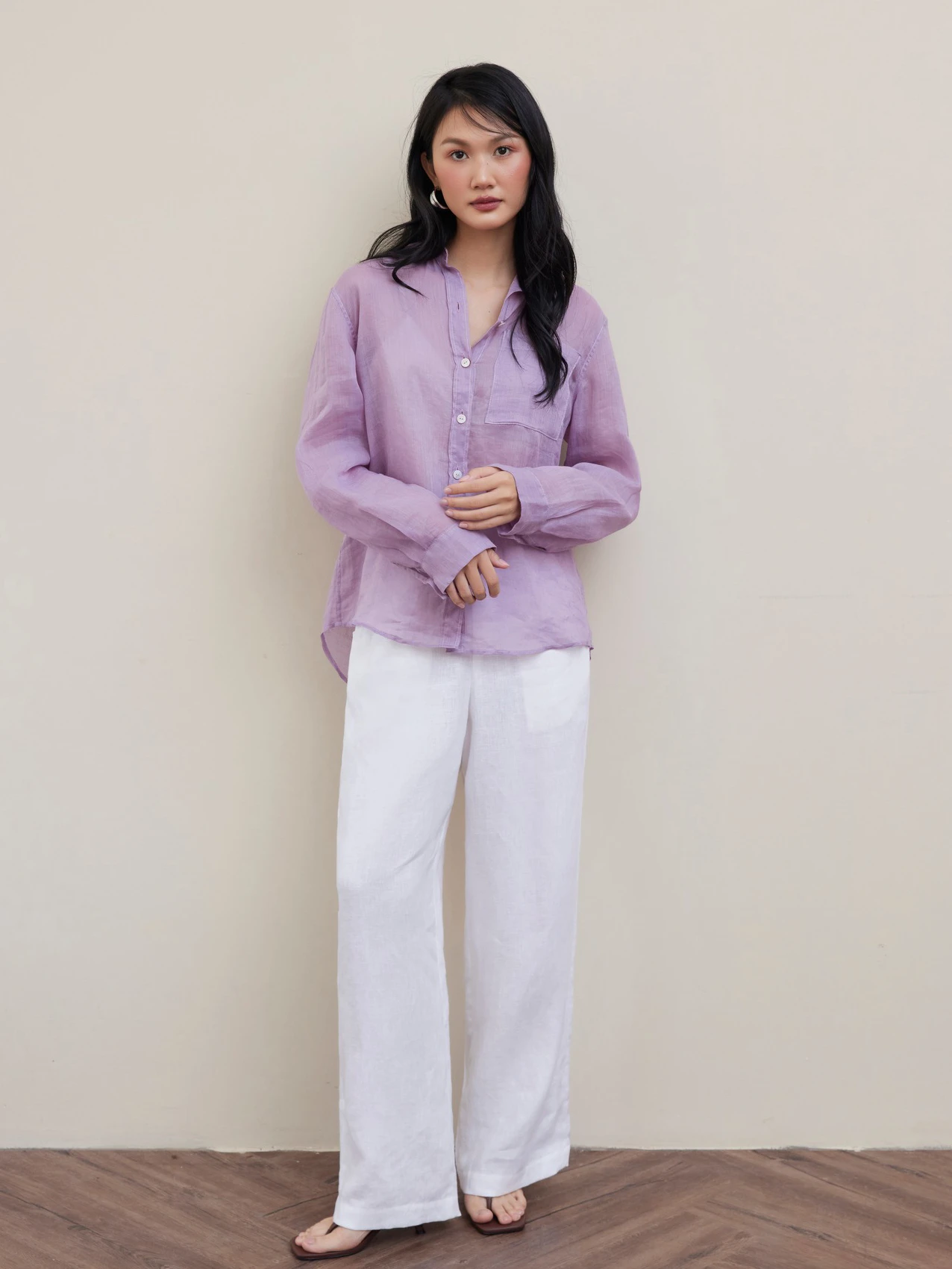 Áo sơ mi linen và quần suông mang lại sự thoải mái và phong cách một cách dễ dàng. Những gam màu tươi sáng như màu trắng, màu muối tiêu, tím hồng, hồng ruốc, xanh pastel… cực kỳ tôn da, tôn dáng
