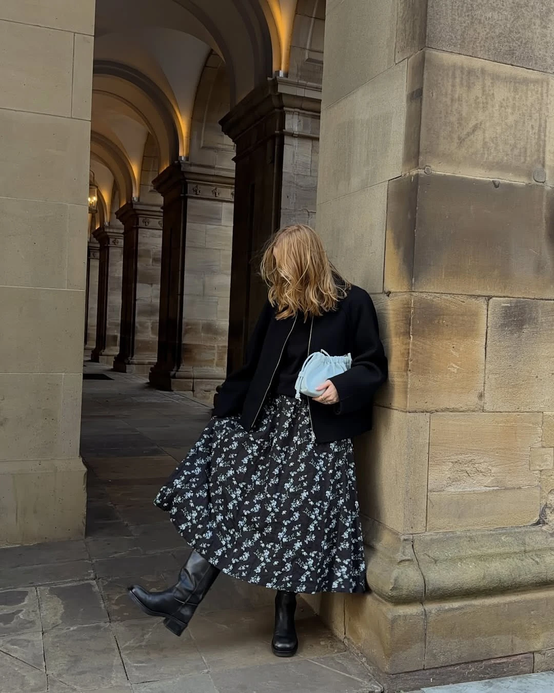 Hòa mình vào phong cách đồng quê với những ý tưởng diện áo váy linen theo cách đầy phóng khoáng, tự do và sáng tạo . Cặp đôi chân váy maxi, áo cổ vuông nhún in hoa và bốt dài làm nên vẻ ngoài sành điệu đầy cá tính