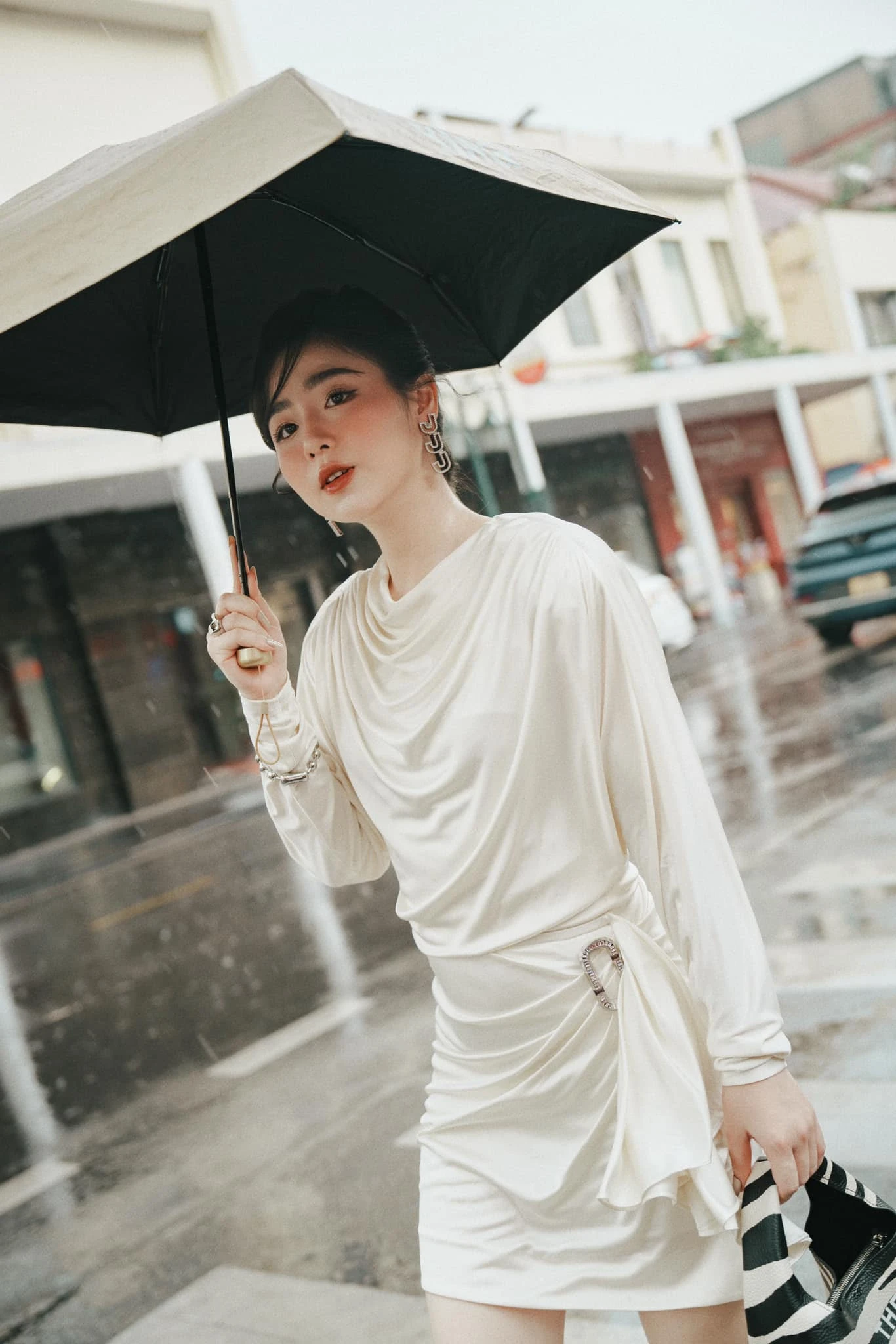 Diện chiếc đầm cúp ngực, kết hợp cùng kiểu tóc búi cao gọn gàng, người đẹp để lộ bờ vai thon thanh mảnh cùng làn da trắng mịn. Gương mặt cô gái được ví như mỹ nhân vì được nét cân đối, hài hòa và thanh thoát.