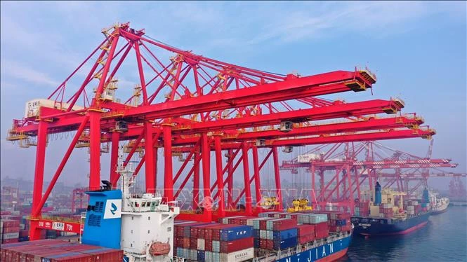 Hoạt động bốc xếp hàng hóa tại cảng ở tỉnh Sơn Đông, Trung Quốc. Ảnh: THX/TTXVN