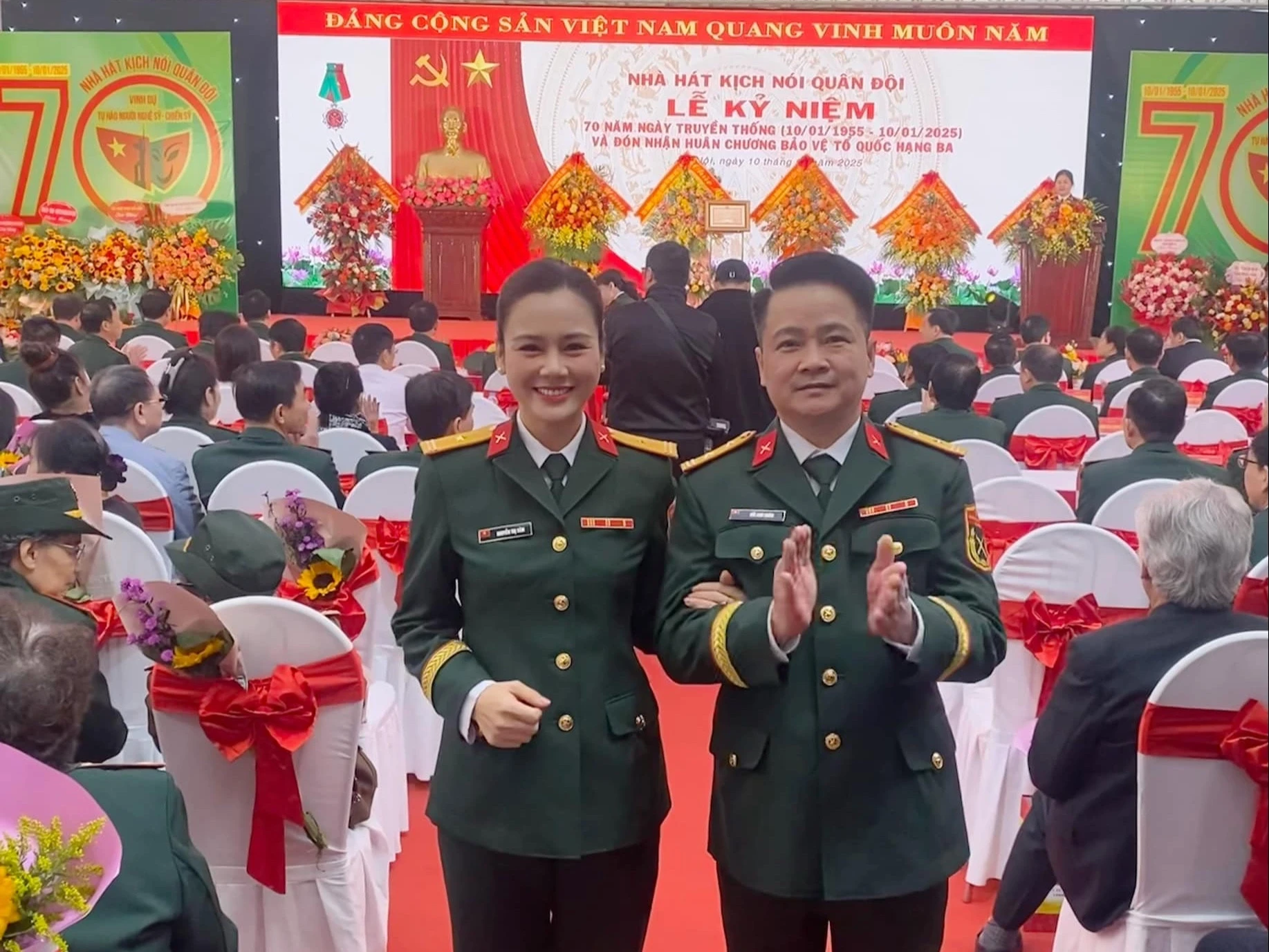 Chồng cô - nghệ sĩ Đới Quân - hiện là Phó Giám đốc Nhà hát kịch nói Quân đội.