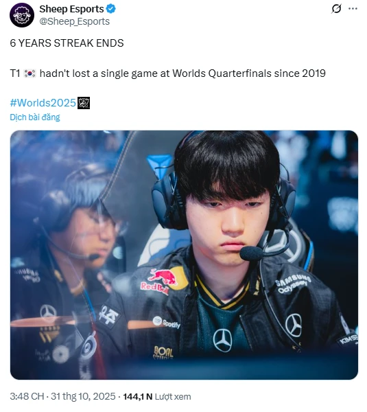 Thành tích không thua ván nào ở Tứ kết CKTG lập từ năm 2019 của T1 đã bị phá vỡ.