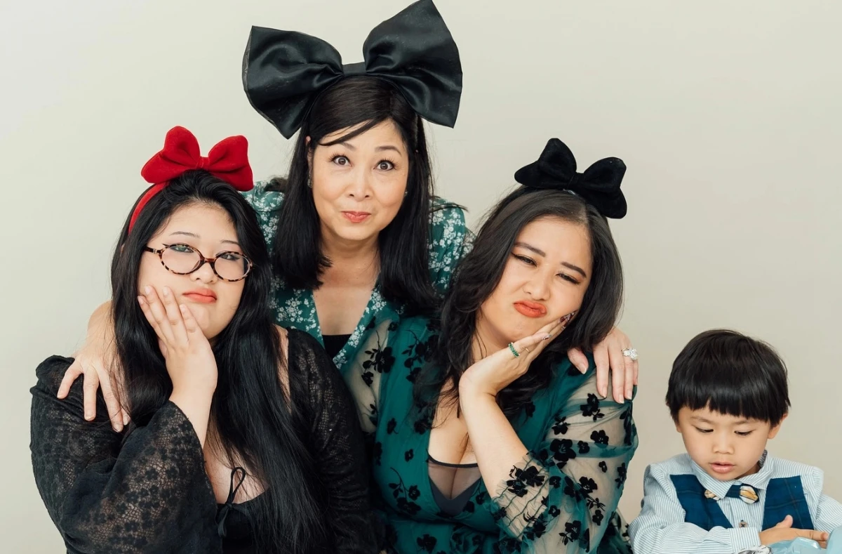 Nghệ sĩ Hồng Vân cho biết chị cùng con út Bí Ngô (bìa trái) mới sang Mỹ thăm con đầu Xí Ngầu và cháu ngoại Simba.