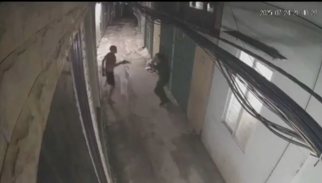Camera an ninh ghi lại hình ảnh đối tượng cầm súng hùng hổ đi ra ngoài chống đối lực lượng chức năng (Ảnh: T.D.).
