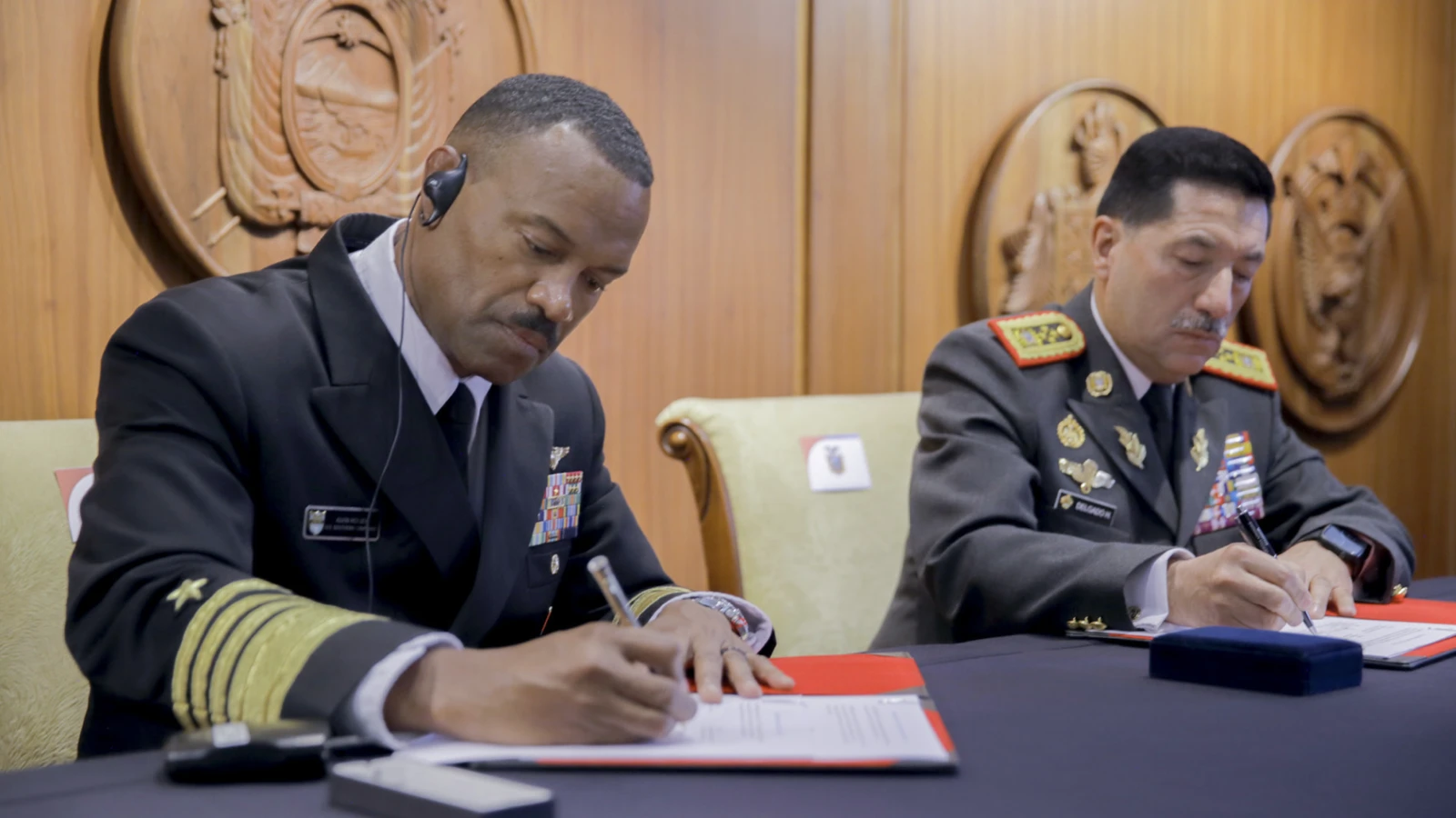 Đô đốc Alvin Holsey (trái), Tư lệnh Bộ Chỉ huy miền Nam (SOUTHCOM) trong lễ ký kết biên bản ghi nhớ an ninh với Tổng tham mưu trưởng Quốc phòng Ecuador tháng 9/2025. Ảnh: Đại sứ quán Mỹ tại Ecuador