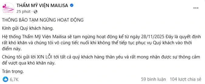 Tối ngày 27/11, trên trang mạng xã hội Facebook có 2,8 triệu người theo dõi, thẩm mỹ viện Mailisa chính thức thông báo tạm ngừng hoạt động kể từ ngày 28/11.