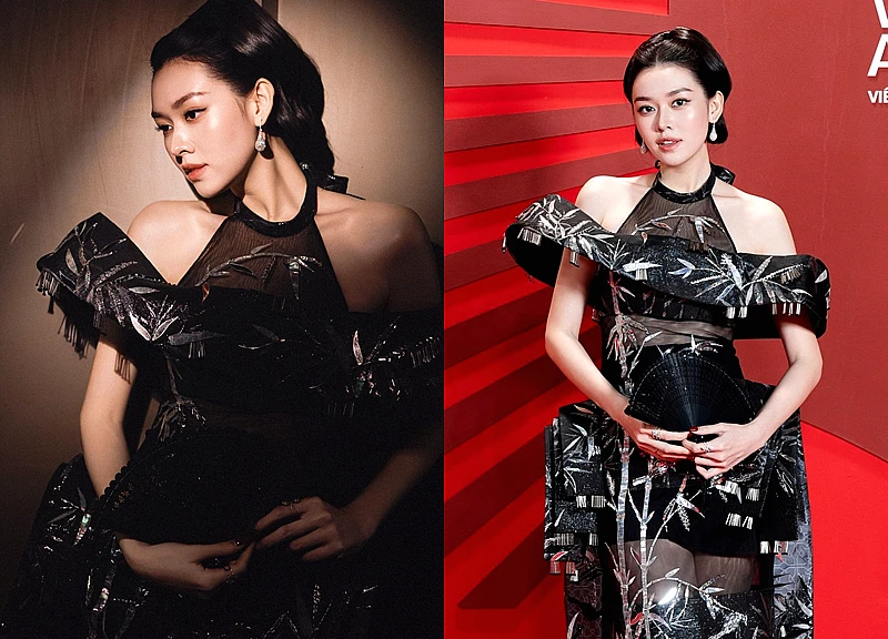 Tường San liên tục dùng quạt cầm tay để che khéo vòng hai, kết hợp với thiết kế trang phục tối màu, phom dáng rộng phần thân trước.