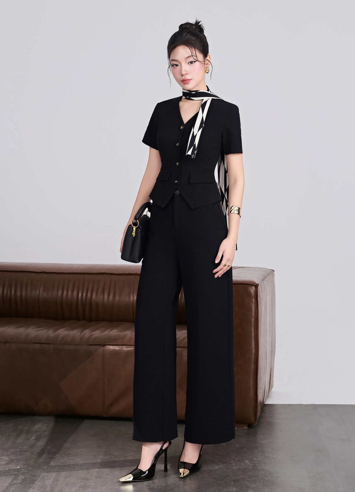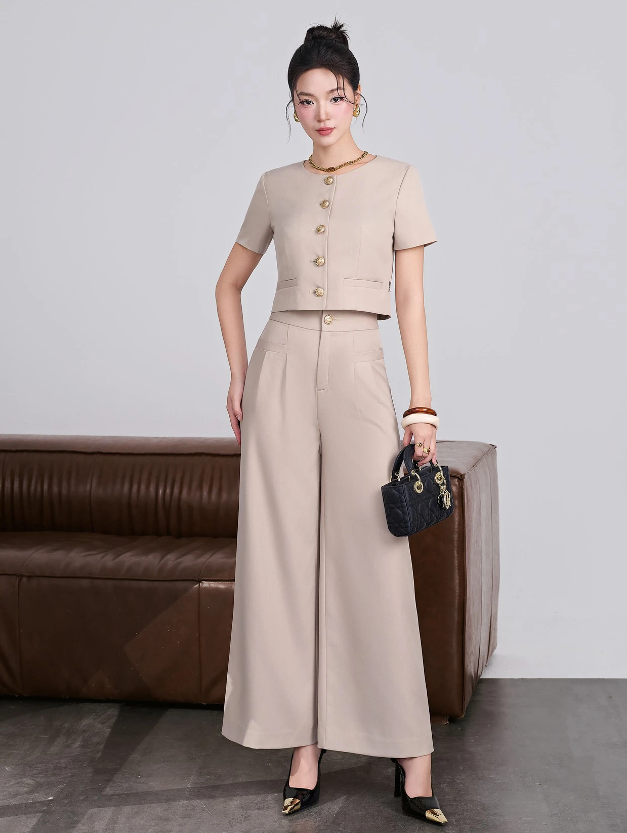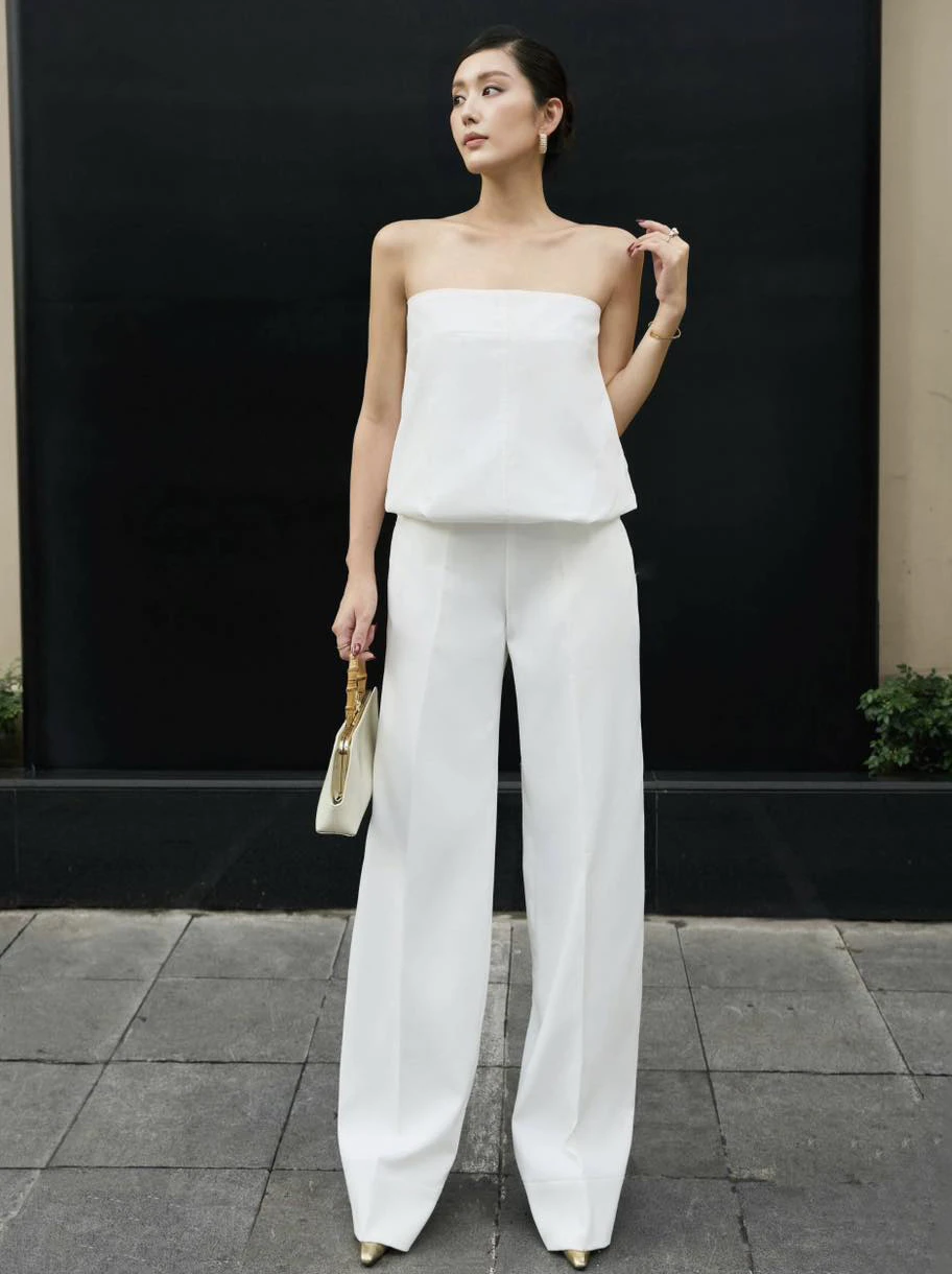 Quý cô nên diện bản phối đồng bộ với các mẫu áo vest, jacket hay blazer dáng crop cùng quần ống rộng để tạo diện mạo trẻ trung và lịch thiệp. Các bản phối kết hợp áo dệt kim, áo organza xuyên thấu hay áo kiểu cách điệu phù hợp với không gian phóng khoáng của những bữa tiệc, các buổi dạo phố hay gặp gỡ bạn bè…