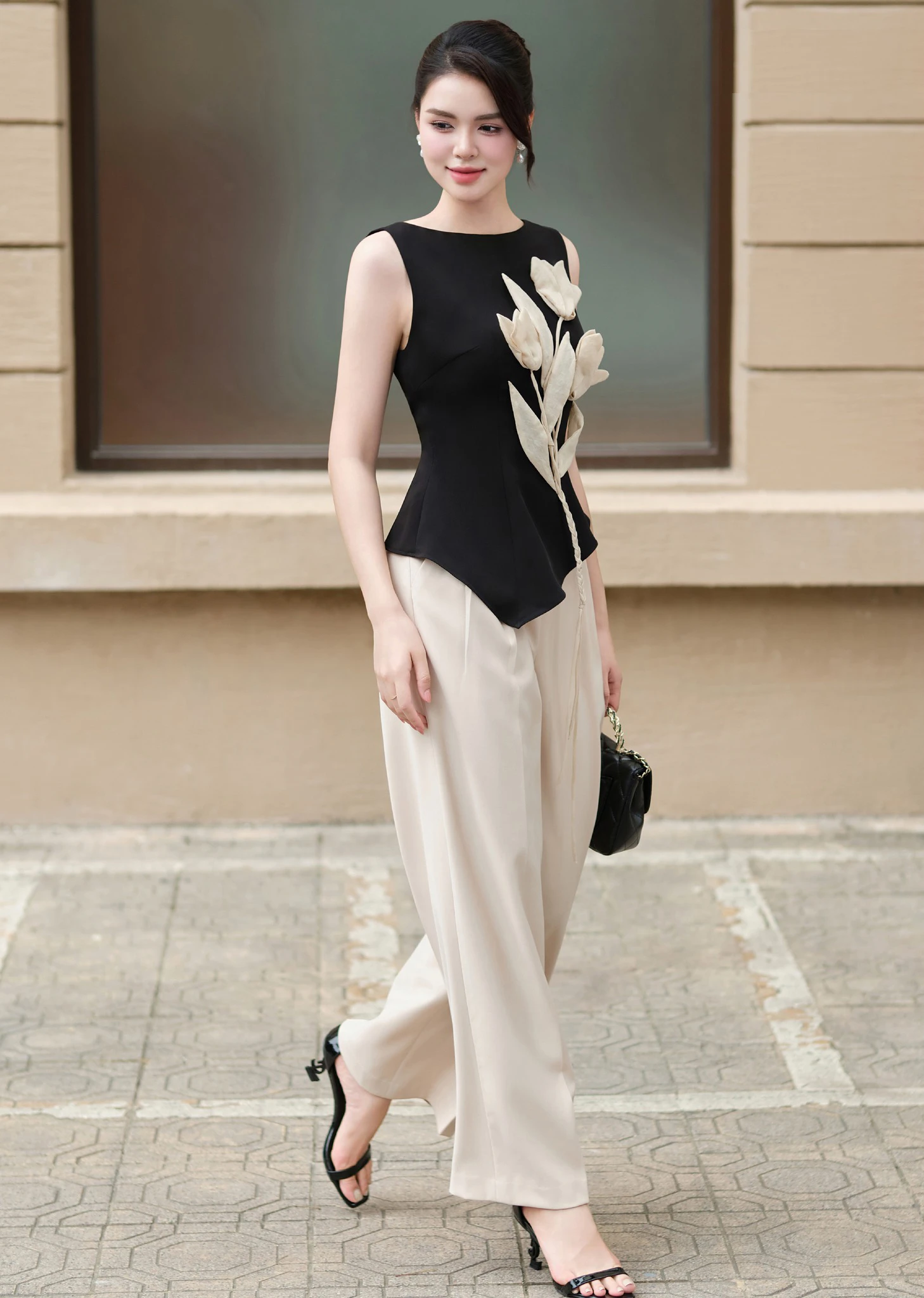 Áo vest cách điệu với điểm nhấn là chi tiết peplum, hoa 3D đính nổi trên thân trước tone sur tone với tông màu của quần âu ống rộng . ẢNH: CHARMILLES
