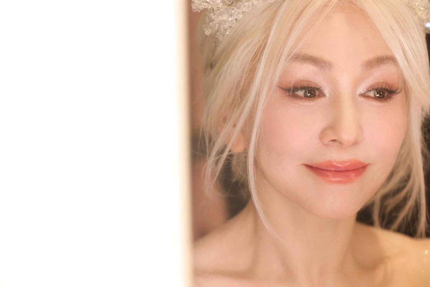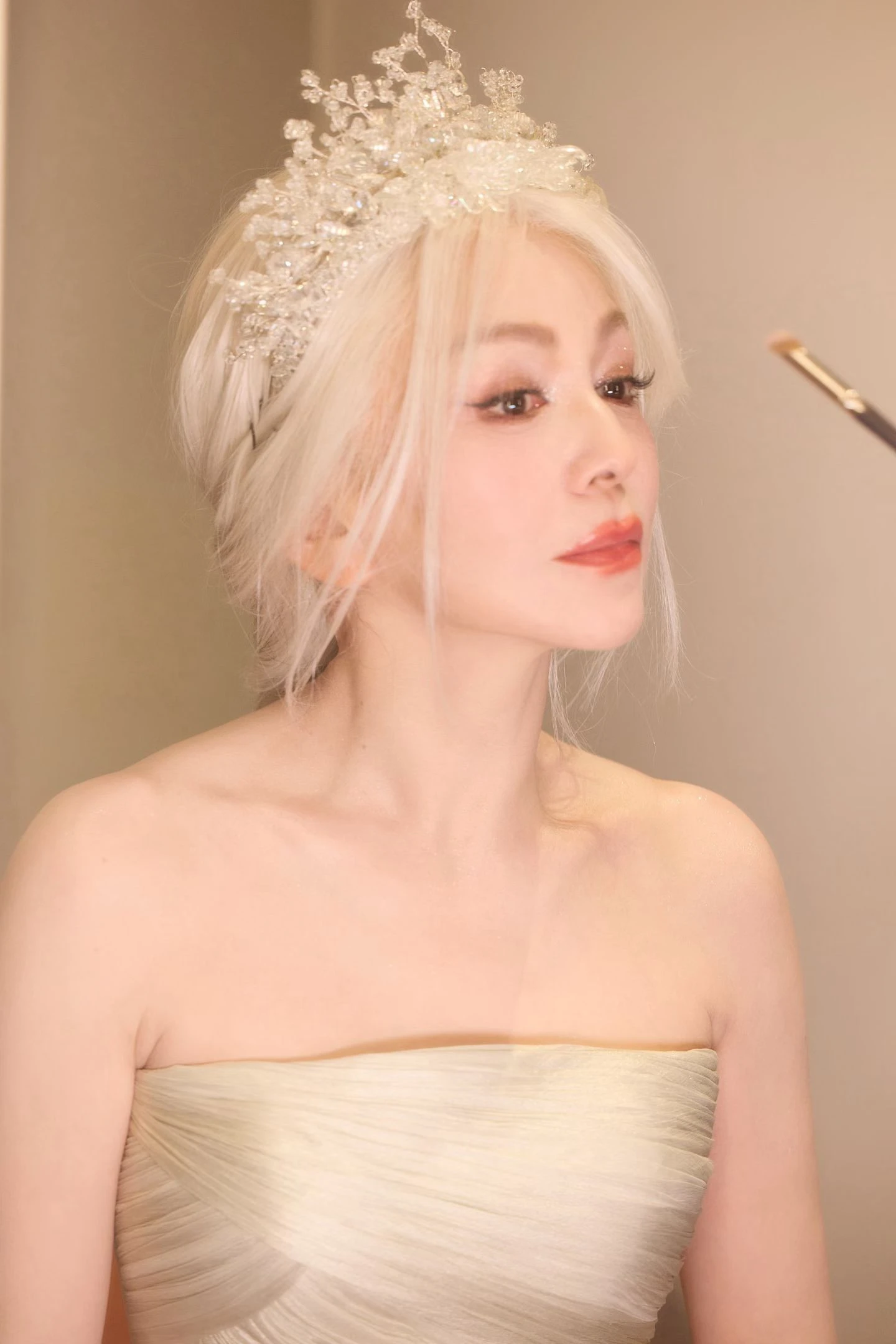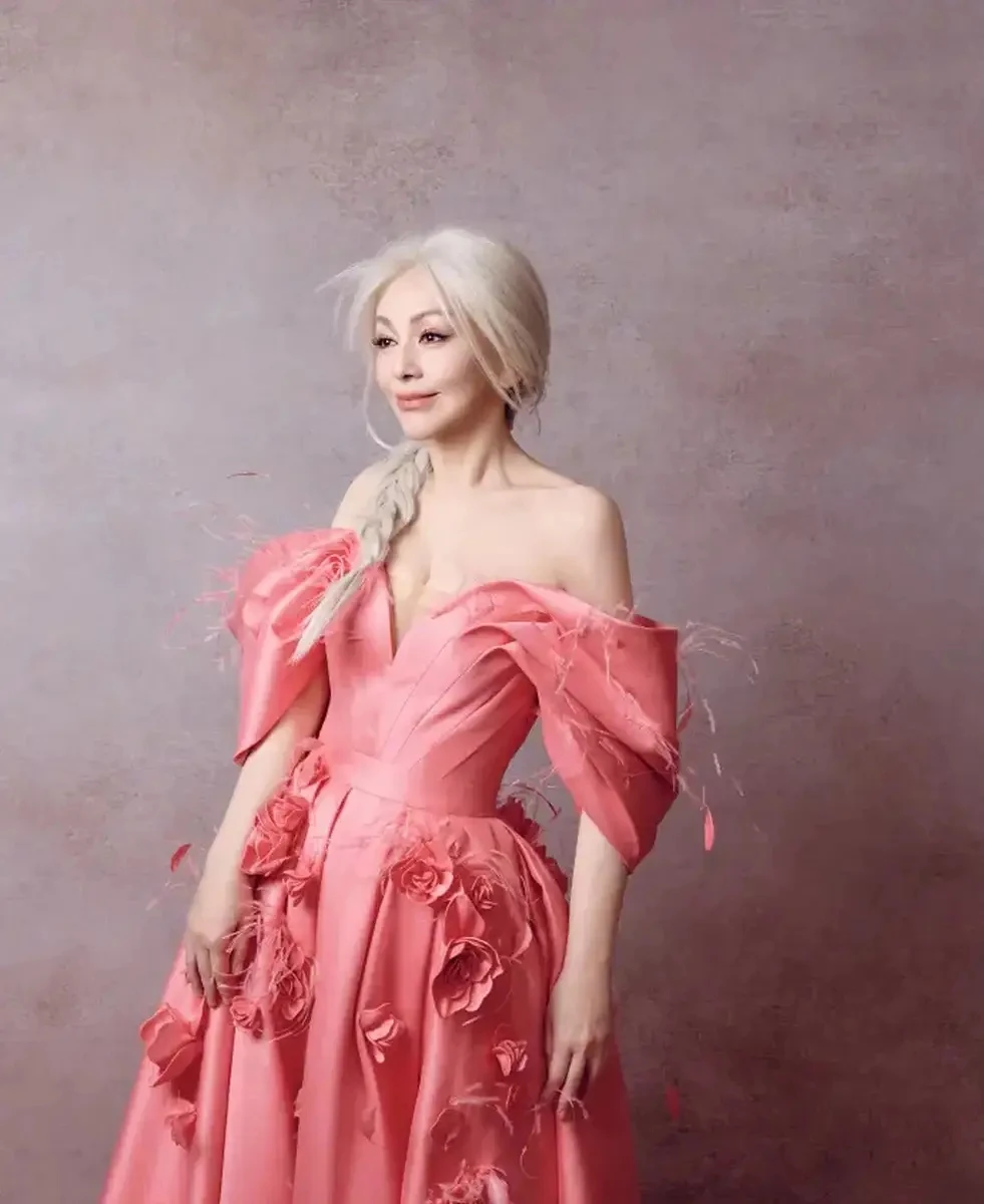 Trong loạt hình được chia sẻ, Vương Lâm diện một chiếc váy dạ hội màu hồng phấn, thiết kế trễ vai với phần thân ôm nhẹ và chân váy xòe rộng. Chất liệu vải đứng form kết hợp cùng các chi tiết đính hoa nổi tạo hiệu ứng mềm mại, bay bổng, gợi liên tưởng đến hình ảnh một nàng công chúa bước ra từ truyện cổ tích. Điểm nhấn đặc biệt nằm ở mái tóc bạc sáng – thay vì nhuộm đen như thường thấy tạo nên tổng thể vừa lạ mắt vừa sang trọng. Nhìn từ xa, nữ diễn viên như một nữ hoàng tuyết đầy quyến rũ