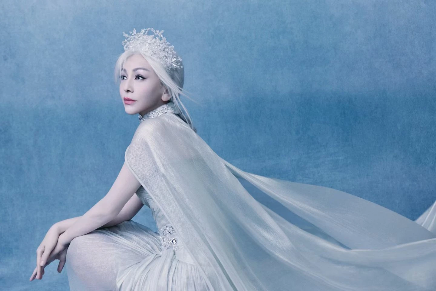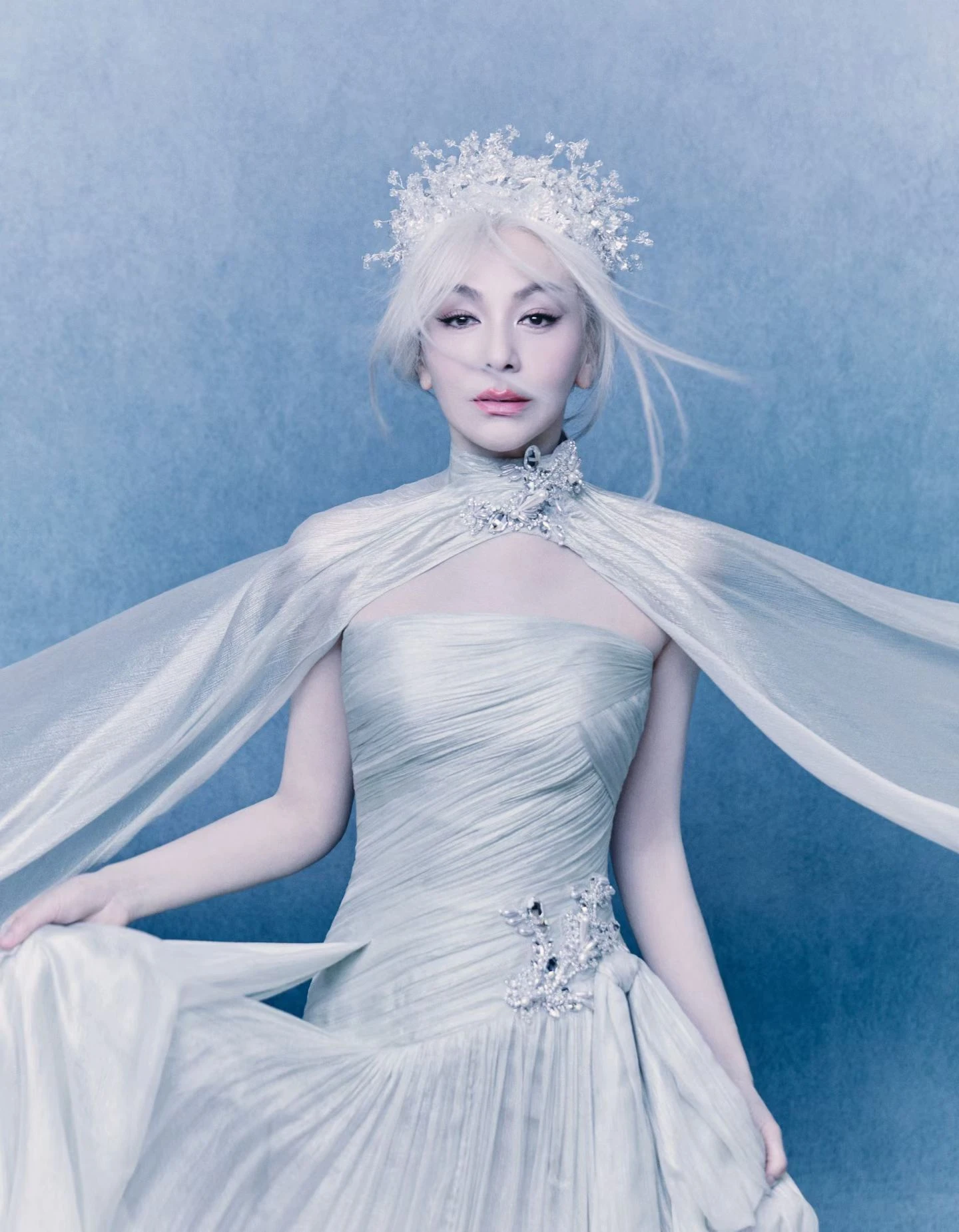 Cùng sự kiện, Vương Lâm còn gây ấn tượng mạnh với một tạo hình hoàn toàn khác khiến dân tình không thể không liên tưởng đến Elsa – Nữ hoàng băng giá. Trong bộ trang phục tông trắng xanh, cô khoác lên mình chiếc váy dạ hội xếp ly tinh xảo, kết hợp cùng áo choàng nhẹ bay và vương miện đính kết cầu kỳ. Tổng thể tạo hình gợi liên tưởng đến hình ảnh nữ hoàng tuyết vừa thanh thoát vừa quyền lực. Việc diện một mẫu váy “lồng lộn” như vậy mà vẫn giữ được khí chất ở độ tuổi U60 như Vương Lâm đúng là không ai làm được.