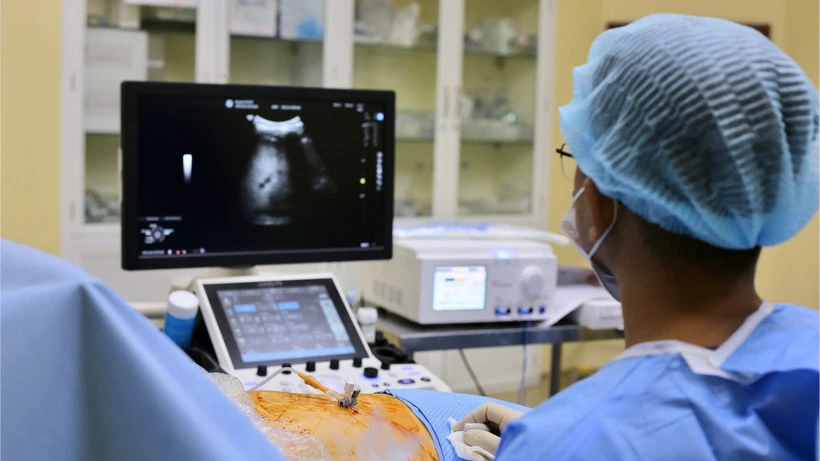 Đồng thời, ê-kíp phối hợp đốt u gan bằng sóng cao tần dưới hướng dẫn của siêu âm để phá hủy tế bào ung thư tại vị trí khối u. Kỹ thuật đốt u gan bằng sóng cao tần được thực hiện dưới hướng dẫn của máy siêu âm cho phép bác sĩ định vị chính xác khối u nhỏ, nhờ đó thực hiện thao tác đúng và an toàn.