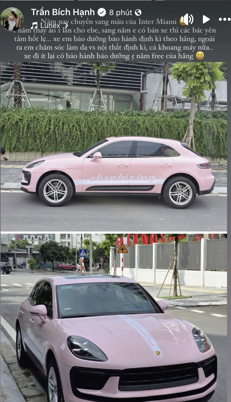 Trần Bích Hạnh - bạn gái hậu vệ Vũ Văn Thanh mới đây thu hút sự chú ý khi liên tiếp khoe loạt xe sang trên mạng xã hội. Trên story cá nhân, Bích Hạnh gây ấn tượng với chiếc Porsche Macan được dán màu hồng ngọt ngào, nổi bật giống với màu sắc áo sân nhà của CLB Inter Miami.