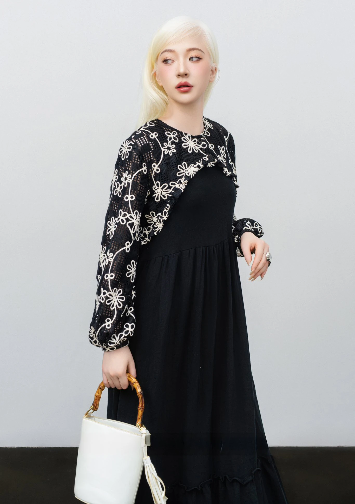 Váy chữ A dáng dài phối áo khoác lửng họa tiết hoa trắng nền đen vải lưới mang đến hình ảnh ấn tượng, nổi bật và thu hút mọi ánh nhìn . ẢNH: LEAPAE STUDIO