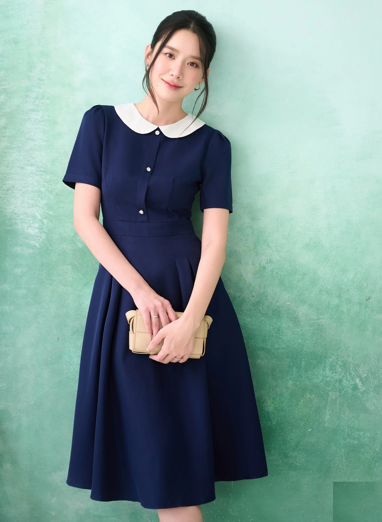 Đầm chữ A tông màu xanh đậm thanh lịch với điểm nhấn là phần cổ sen màu trắng. Vẻ đẹp tinh giản nhưng đầy nữ tính, quyến rũ nhưng vẫn chỉn chu hoàn hảo giúp thiết kế được tăng thêm khả năng ứng dụng cho nhiều không gian