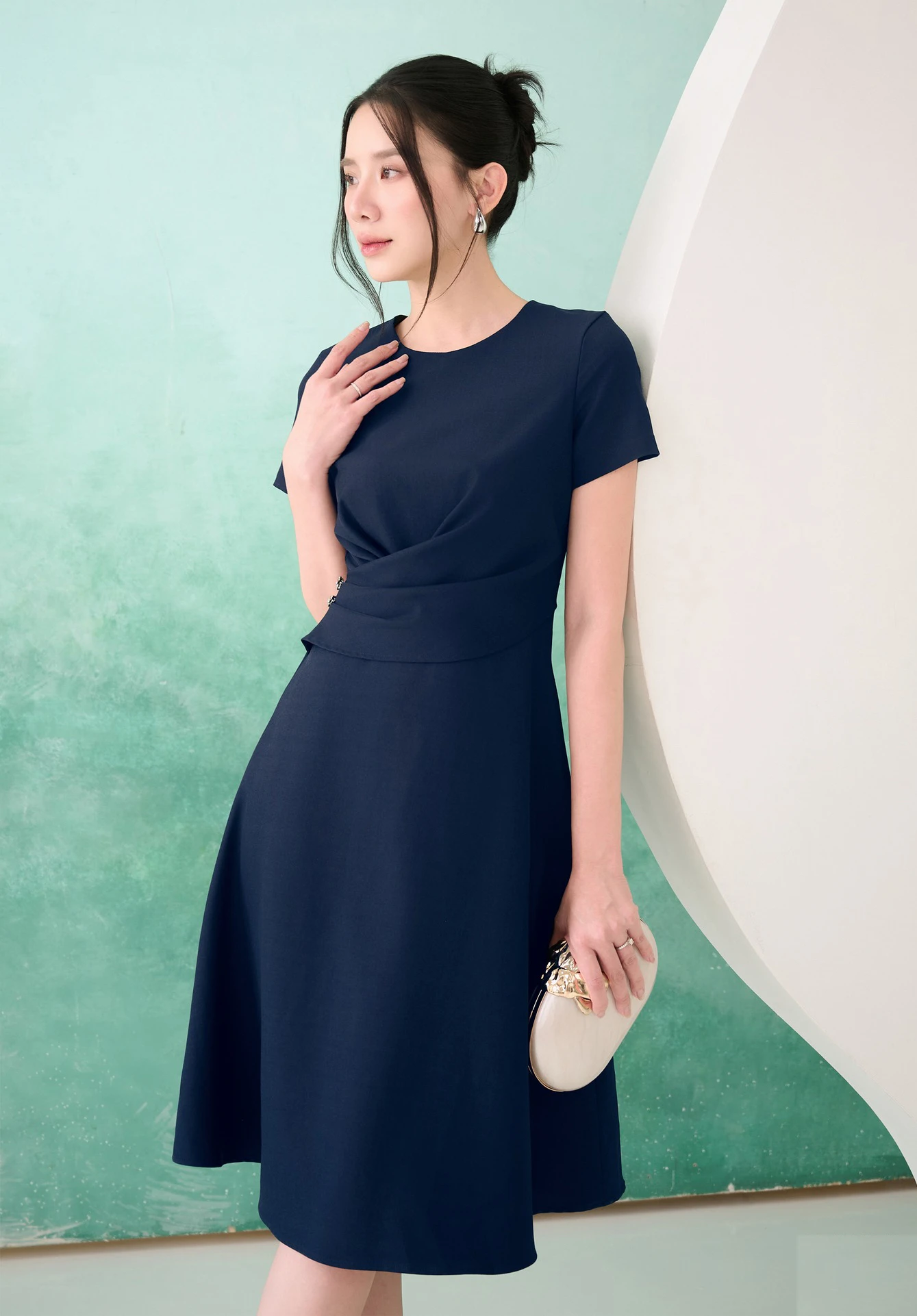Đầm A xoắn eo nhẹ nhàng tôn nét tối giản, thanh lịch nhưng vẫn có sức hút riêng cho nàng văn phòng, cho quý cô dạo phố mùa thu . ẢNH: GUMAC
