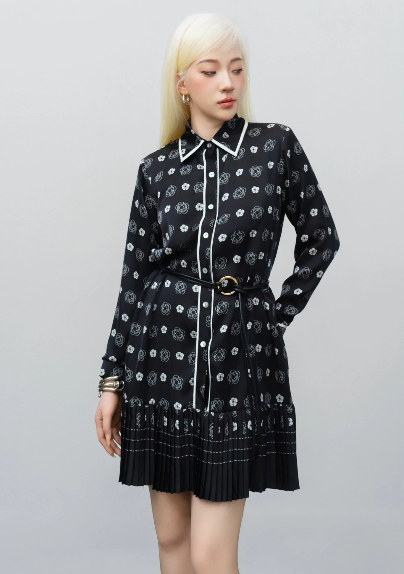 Lựa chọn váy sơ mi in họa tiết dáng chữ A cho nàng sẵn sàng đi học, đi làm mỗi ngày. Nét riêng của trang phục nằm ở chi tiết xếp ly chân váy đi cùng các đường viền tone sur tone với họa tiết in trên vải lụa satin