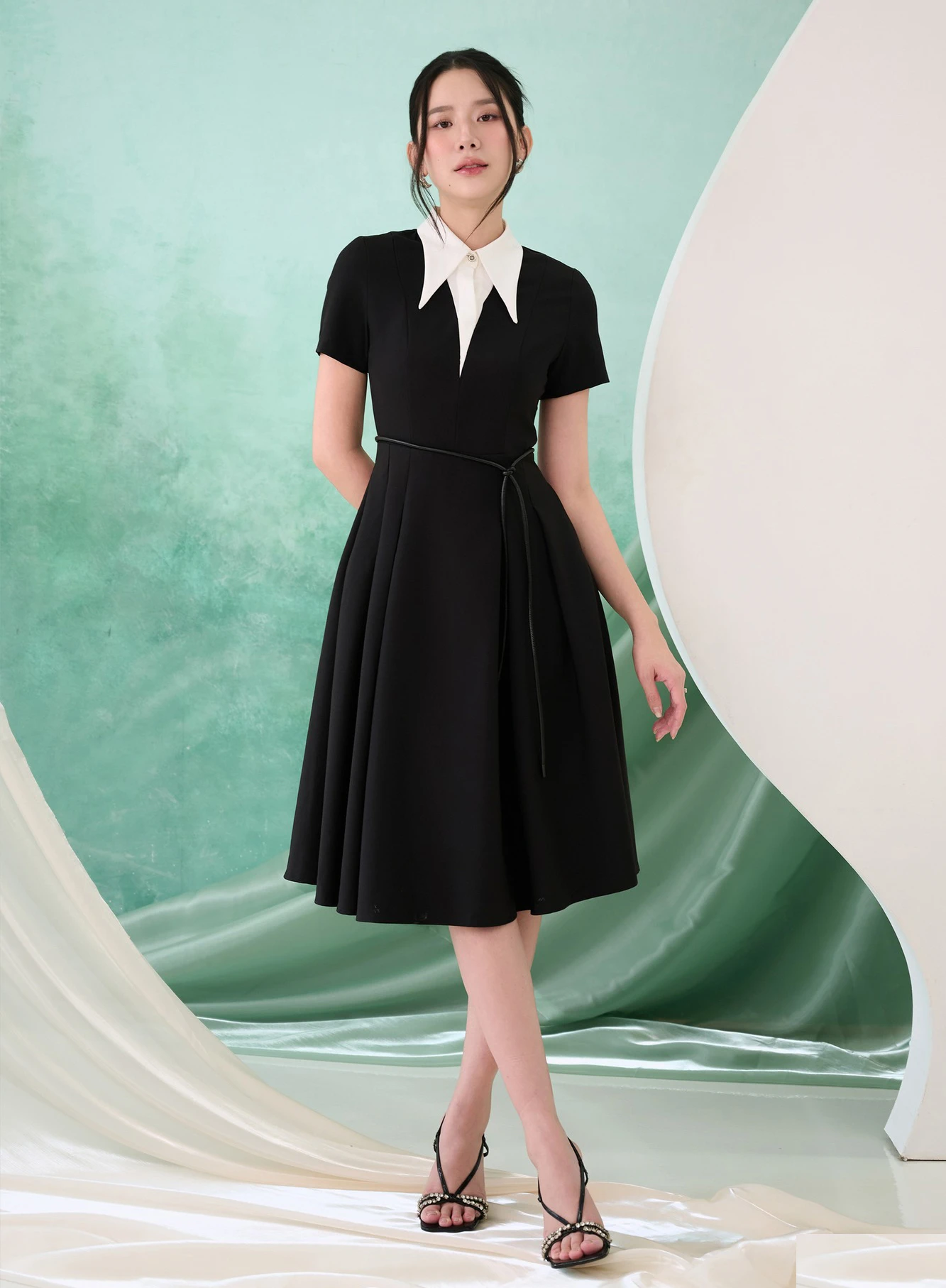 Bản phối kết hợp hai gam màu trắng đen cổ điển trở nên thời trang và đậm tính xu hướng hơn khi kết hợp hình dáng cổ nhọn và dây hoa vải buộc eo. Đầm liền dáng chữ A chính là cấu trúc trang phục đa nhiệm bậc nhất tủ đồ