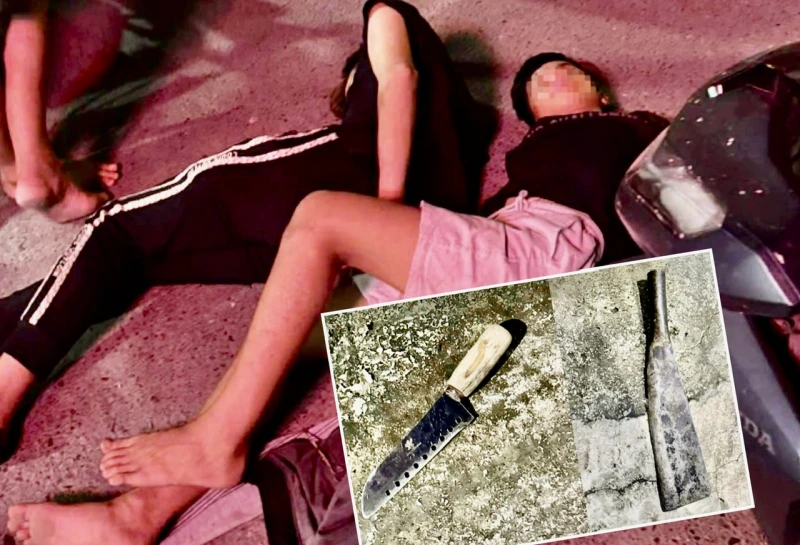 2 đối tượng trong nhóm bị người dân khống chế, thu 2 con dao.