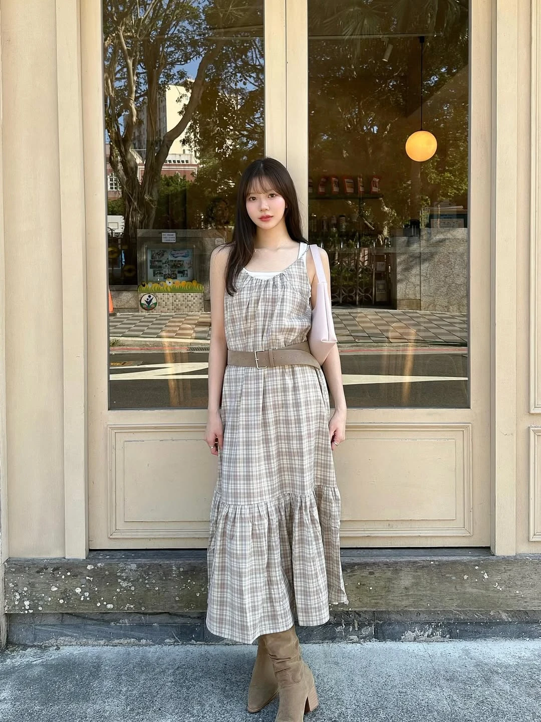 Chiếc váy hai dây họa tiết ca rô dáng dài trở thành điểm nhìn trung tâm, gam màu nâu mang nét cổ điển. Chiếc thắt lưng giúp tôn lên đường cong cơ thể và mang lại cấu trúc rõ ràng cho dáng váy. Túi xách đeo vai màu trắng sữa với thiết kế tối giản góp phần duy trì hình ảnh nhẹ nhàng, trong khi đôi bốt cao cổ tông nâu đất tạo sự hài hòa với váy