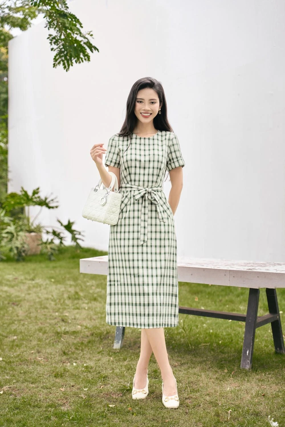 Chiếc váy ca rô sát nách tông xanh rêu phối vàng nhạt, ôm vừa phần thân trên và mở dần ở chân váy. Họa tiết ca rô bản to giúp tăng chiều sâu thị giác, chiếc túi xách trắng kem dáng hộp điểm kim loại ánh vàng, trở thành điểm sáng tinh tế