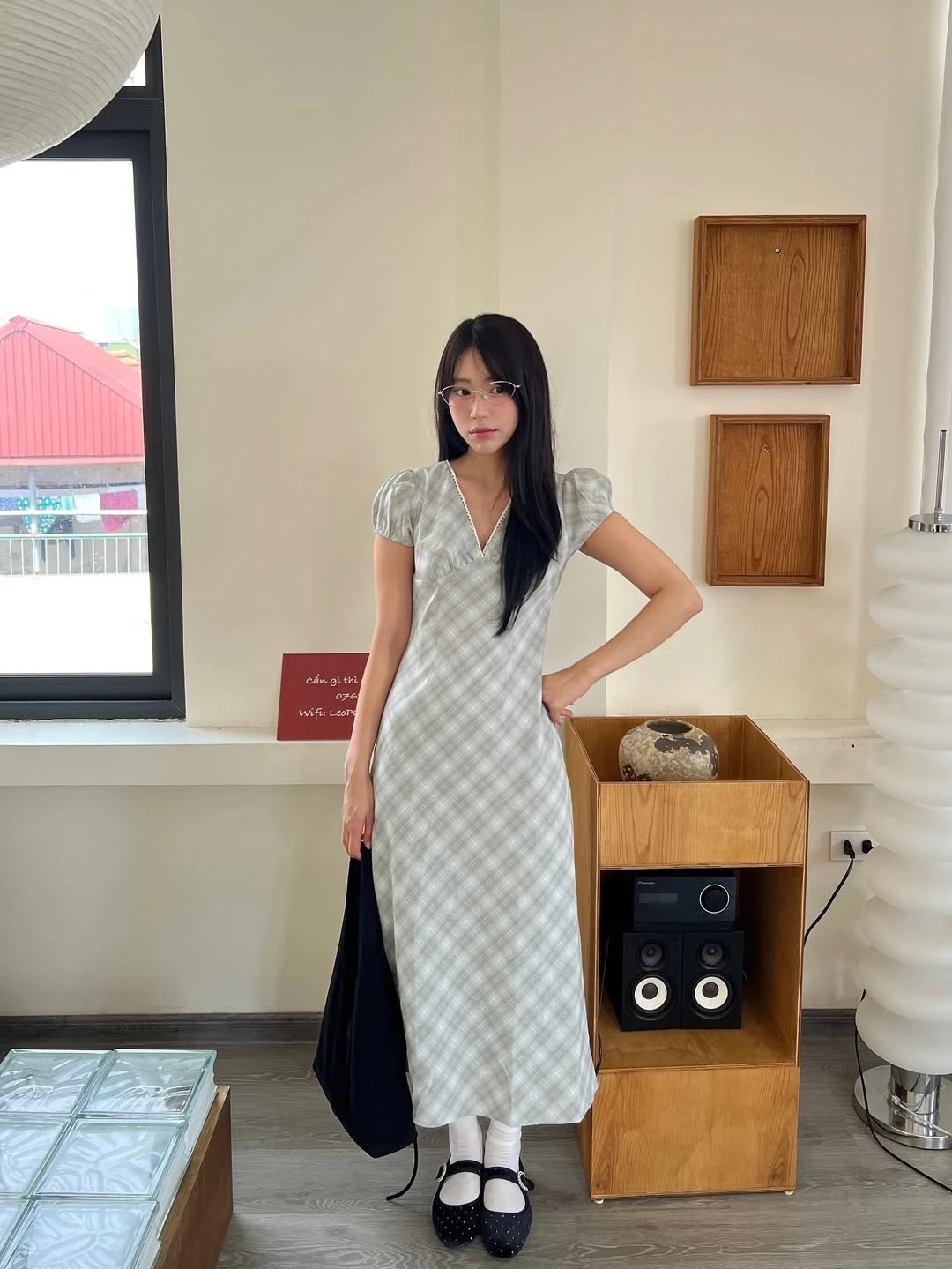 Váy dài ca rô tông xanh xám nhạt, phom váy ôm vừa cơ thể giúp tôn dáng mà không tạo cảm giác phô trương, chi tiết cổ chéo mang đến điểm nhấn mềm mại. Phối cùng tất trắng và giày búp bê đen gợi lên sắc thái cổ điển quen thuộc, trong khi túi vải đen dáng mềm khiến bản phối gần gũi hơn với đời sống thường ngày