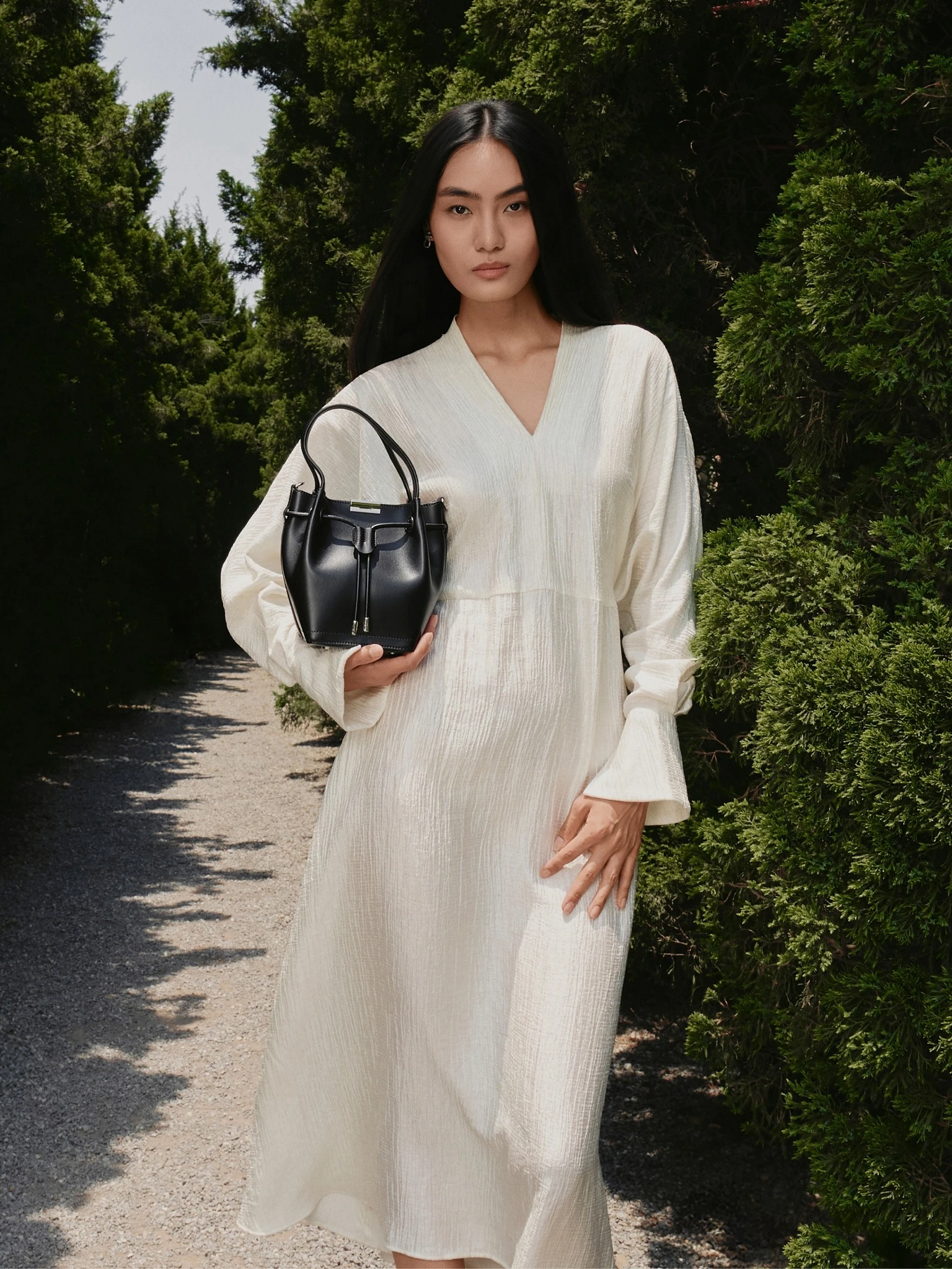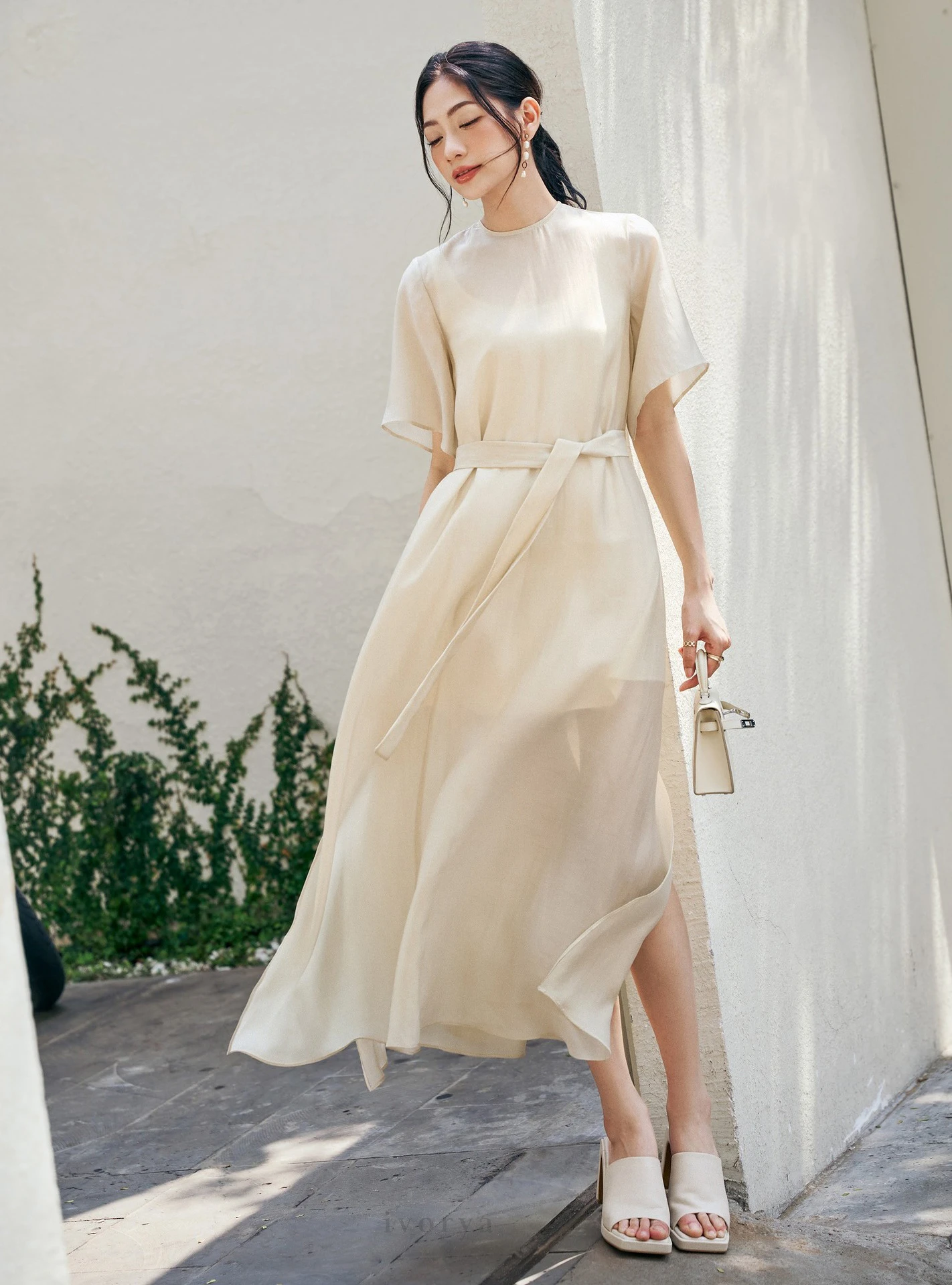 Váy màu cream thanh lịch, nữ tính với những điểm nhấn tinh tế như phần cổ V cổ điển, tay chít loe, tùng váy buông nhẹ dọc theo vóc dáng của nàng