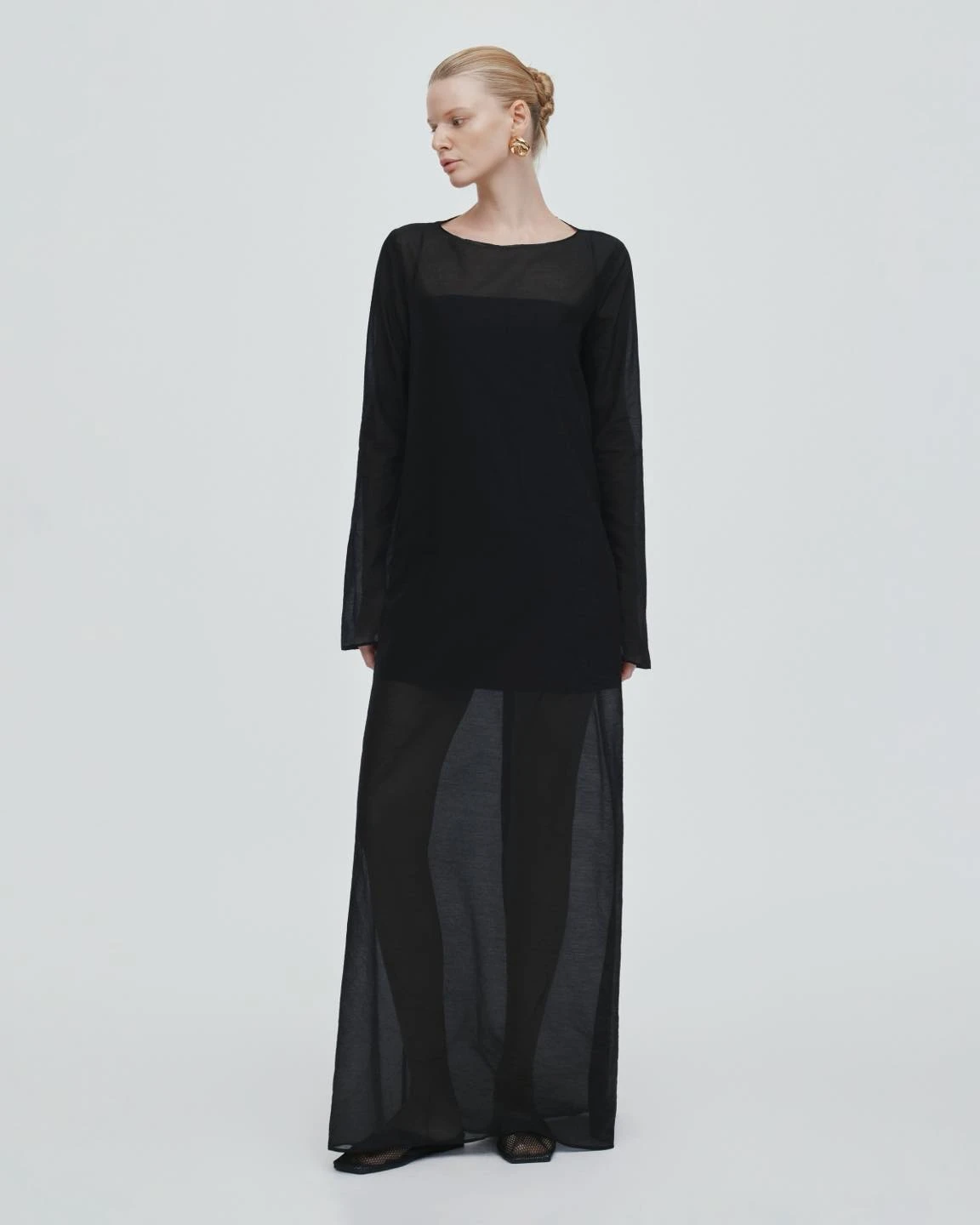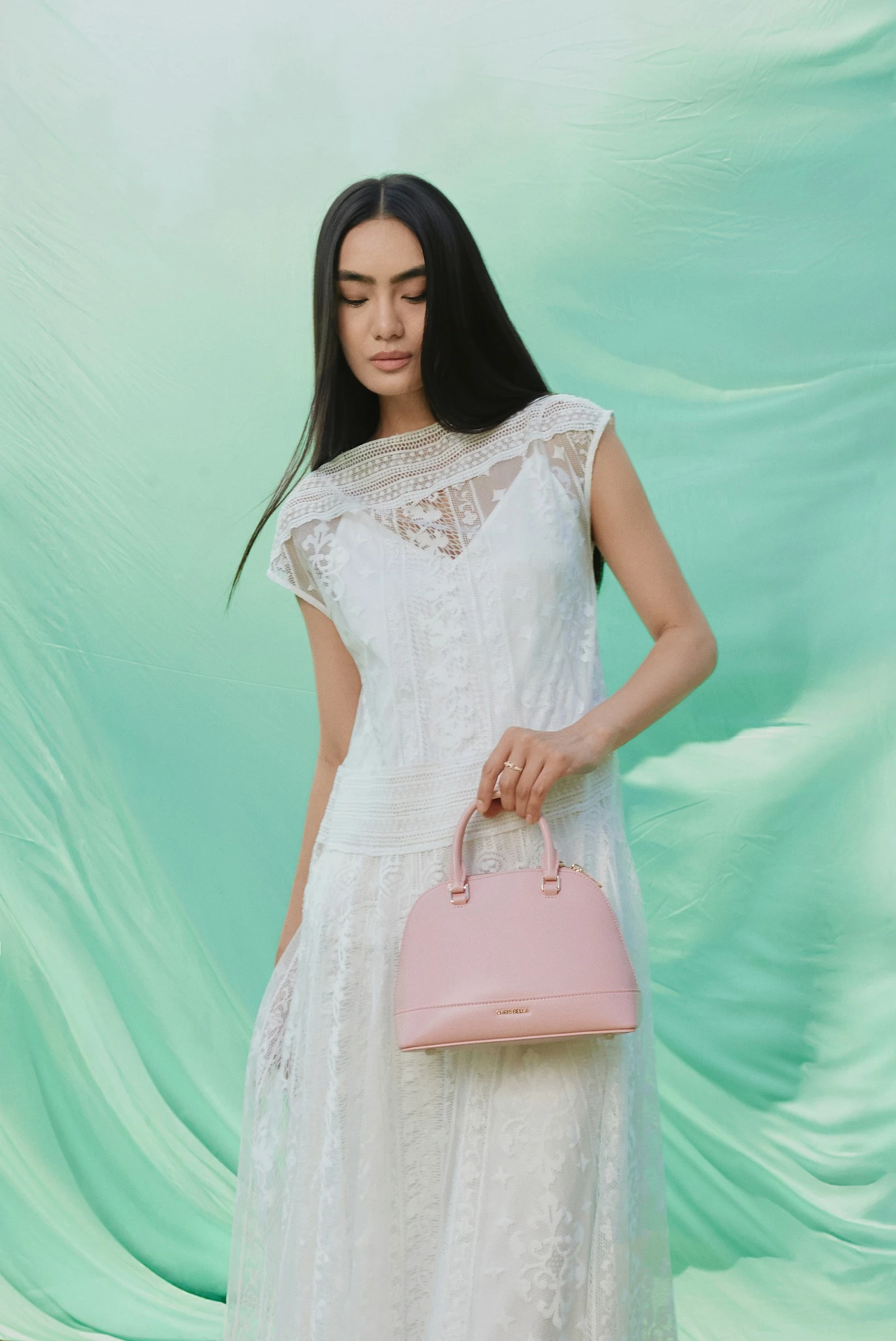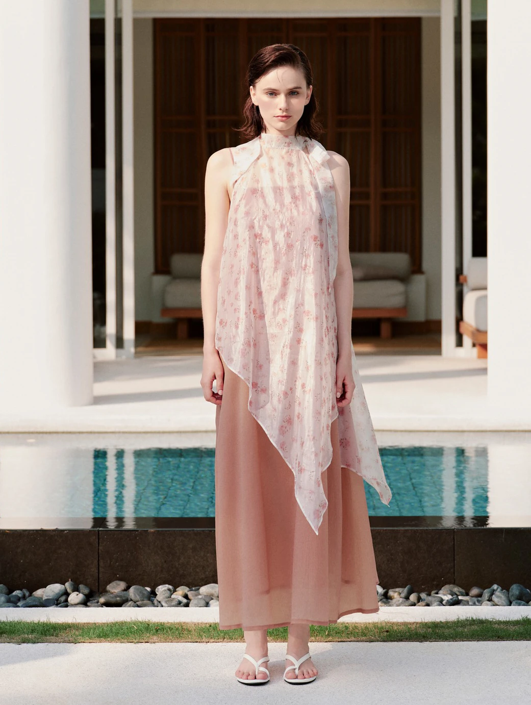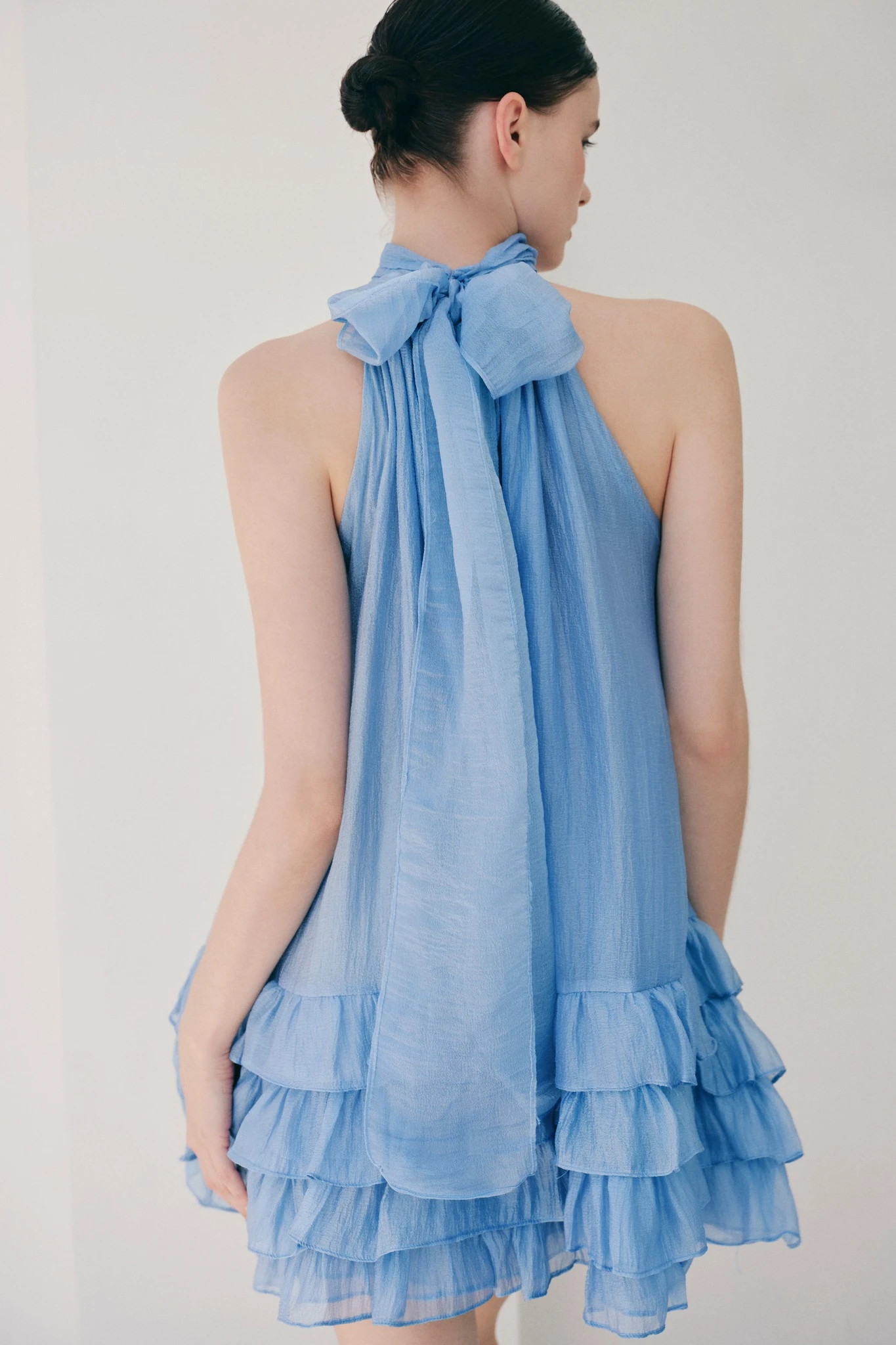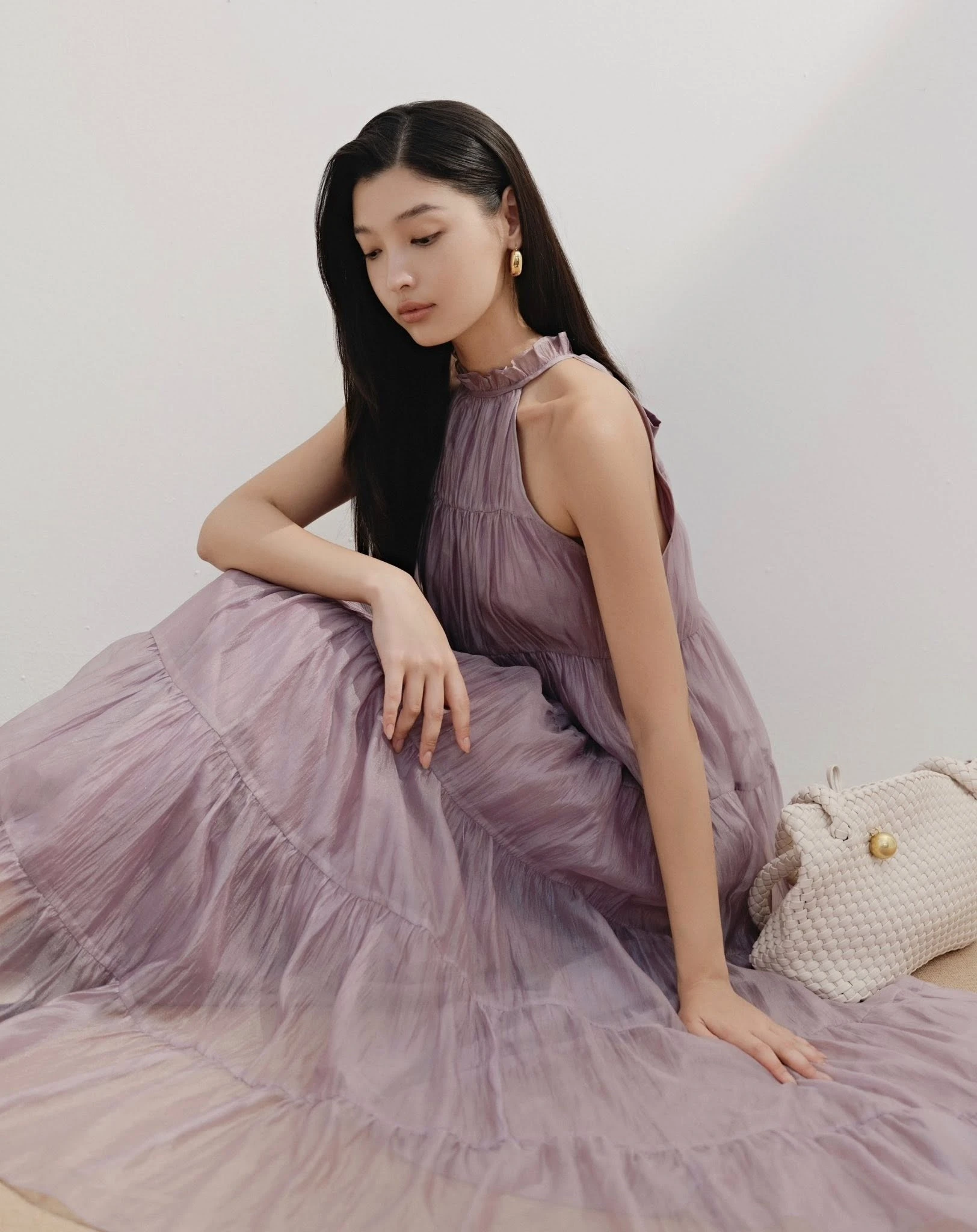 Chất voan tơ mỏng nhẹ, mềm mại và có độ bay làm nên kiểu váy cổ yếm dáng suông, tùng váy phân tầng nhiều lớp tạo độ bồng bềnh, kiều diễm cho phong cách tiểu thư đài các