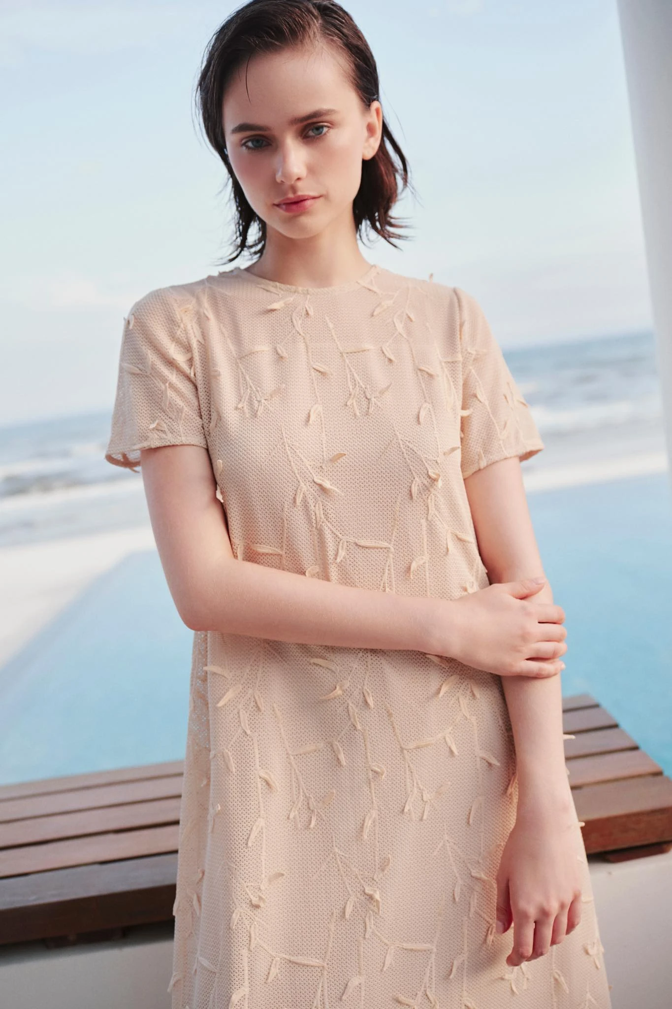 Chất liệu vải dệt kim mỏng, crochet... chính là một điểm nhấn thú vị mang nhiều ẩn số cho mùa thu. Thiết kế suông ghi điểm với gam màu beige ấm, chi tiết hoa lá trên nền vải đan móc tinh tế và đặc sắc