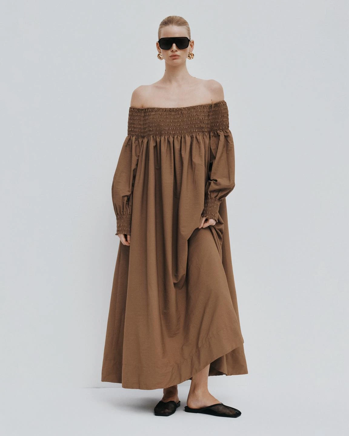 Mỗi bản phối là một cuộc dạo chơi khám phá về phong cách thời trang của nàng. Váy trễ vai tông nâu trầm tôn vai cổ và phong cách cá tính quyến rũ; thiết kế layer khéo léo khơi gợi trí tưởng tượng qua lớp vải xuyên thấu mang sắc đen bí ẩn, kiêu sa