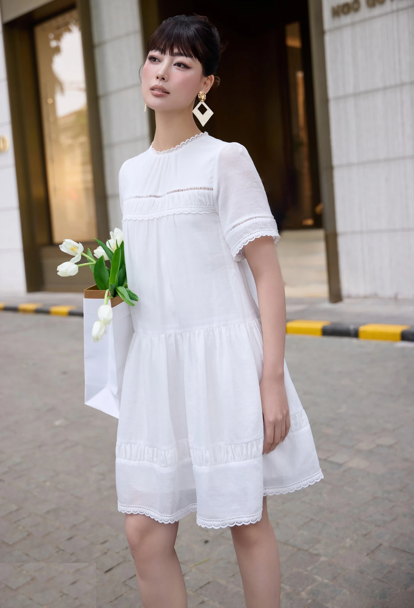 Nhẹ nhàng, nữ tính khi dạo phố cùng váy suông dáng ngắn màu trắng. Các chi tiết viền ren và đăng ten làm nên dáng vẻ tiểu thư sang chảnh, giúp nàng thu hút mọi ánh mắt ngắm nhìn