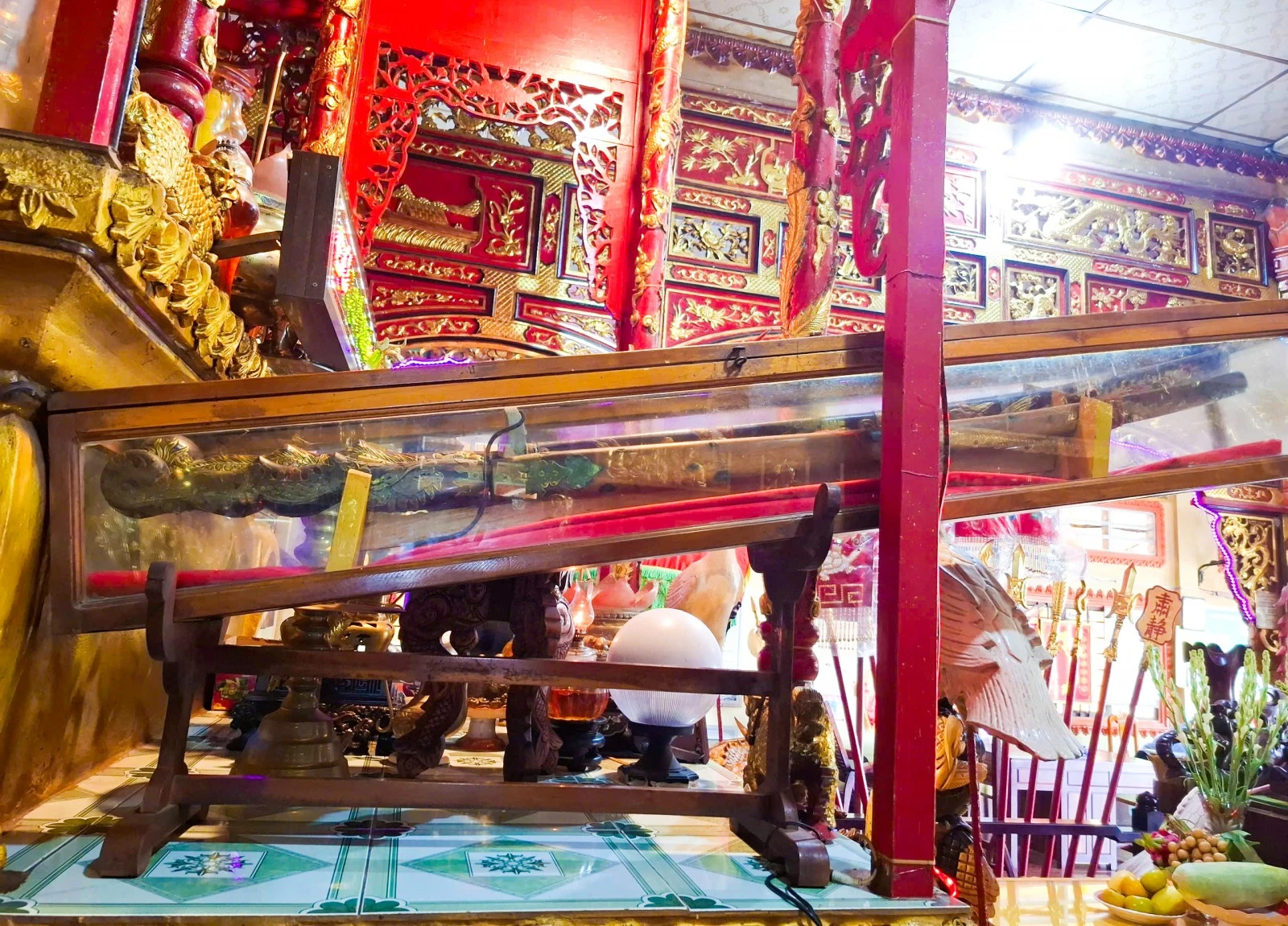Trong dinh hiện còn lưu giữ đôi gươm được cho là của Quản cơ Trần Văn Thành sử dụng lúc sinh thời. Hai thanh gươm có trọng lượng 5,5kg – 5,8kg, dài 1,6m, đòi hỏi người sử dụng phải có sức khỏe cường tráng.