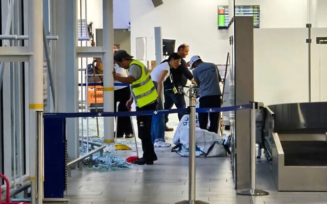 Các nhân viên sân bay Ramon thu dọn các mảnh vỡ sau vụ tấn công của Houthi. Ảnh: Times of Israel