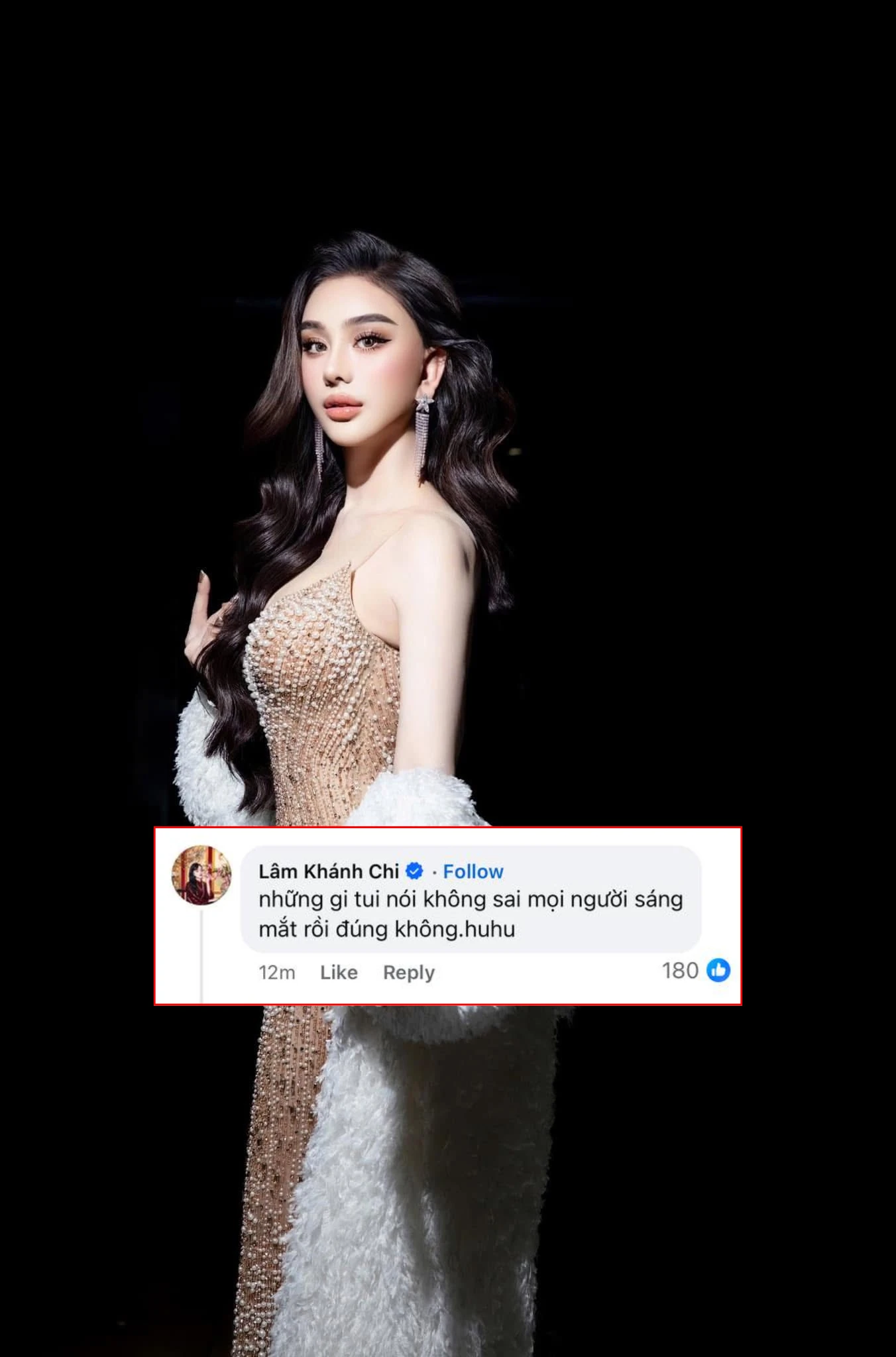 Theo đó, Lâm Khánh Chi đã chia sẻ lại thông tin vụ việc về trang cá nhân và dưới bài viết đã để lại 1 câu: "Ch** tui quá trời, giờ mọi người sáng mắt chưa". Trước đó, trong một bài đăng trên mạng xã hội, Lâm Khánh Chi cũng có thái độ gắt với bình luận: "Những gì tui nói không sai, mọi người sáng mắt rồi đúng không".