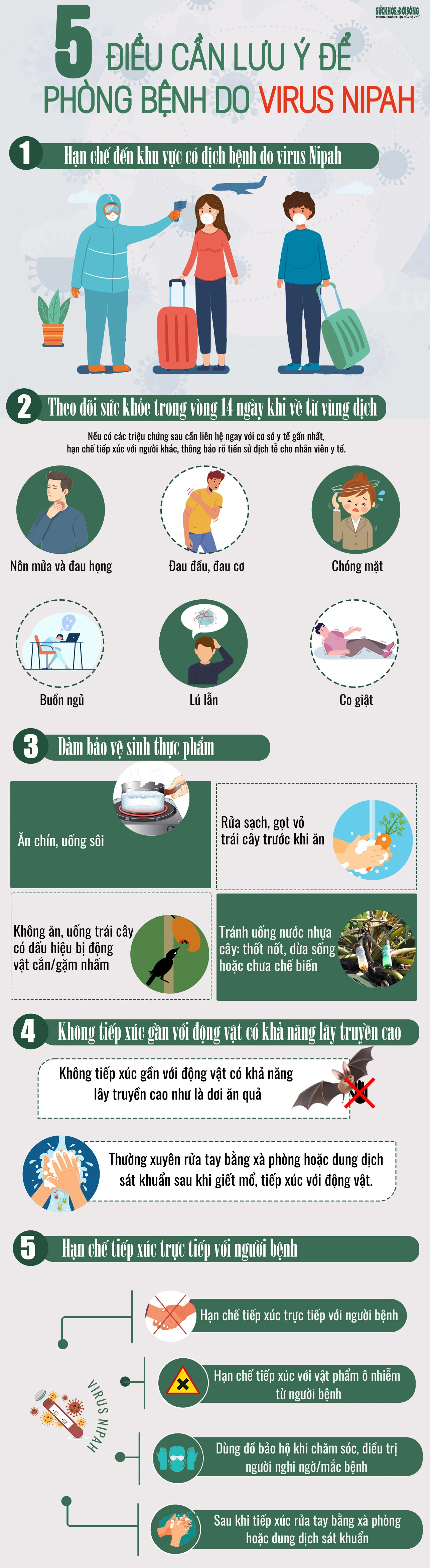 Bộ Y tế khuyến cáo người dân hạn chế đến khu vực có dịch bệnh do virus Nipah nếu không thực sự cần thiết; tự theo dõi sức khỏe trong vòng 14 ngày kể từ khi về từ vùng dịch; đảm bảo vệ sinh thực phẩm, "ăn chín, uống sôi", không ăn, uống các loại trái cây có dấu hiệu bị động vật (dơi, chim) cắn hoặc gặm nhấm; không tiếp xúc gần với động vật có khả năng lây truyền cao dơi; thường xuyên rửa tay bằng xà phòng hoặc dung dịch sát khuẩn sau khi giết mổ, tiếp xúc với động vật...