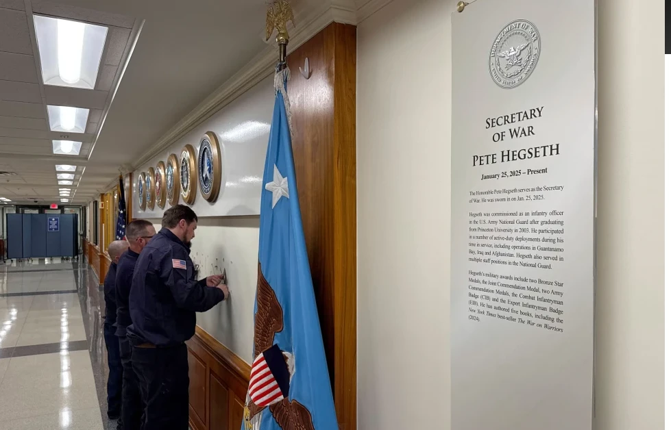 Theo đó, người đứng đầu Bộ Chiến tranh Pete Hegseth đã nhanh chóng hưởng ứng việc “tái thiết thương hiệu” và lập tức áp dụng tên gọi mới. Cụ thể, ông Hegseth đã chỉ đạo tháo bỏ dòng chữ mạ vàng lớn “Secretary of Defense” ( Bộ Quốc phòng ) bên ngoài văn phòng và thay thế bằng tấm biển mới ghi “ Secretary of War ” (Bộ Chiến tranh). Trang web chính thức của Lầu Năm Góc cũng được chuyển từ tên miền defense.gov sang war.gov ngay trong ngày Tổng thống Donald Trump ký ban hành sắc lệnh hồi tháng 9/2025.