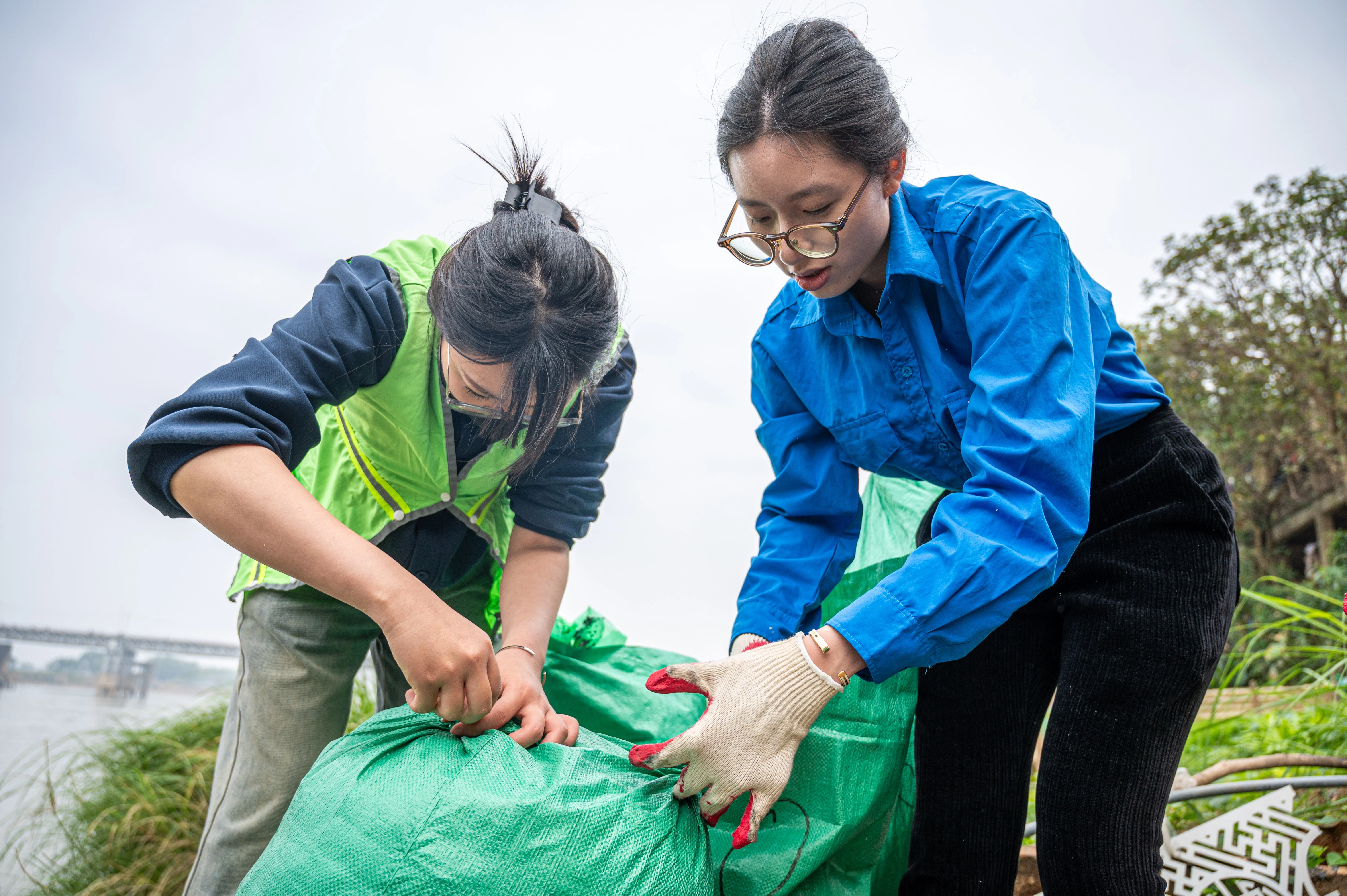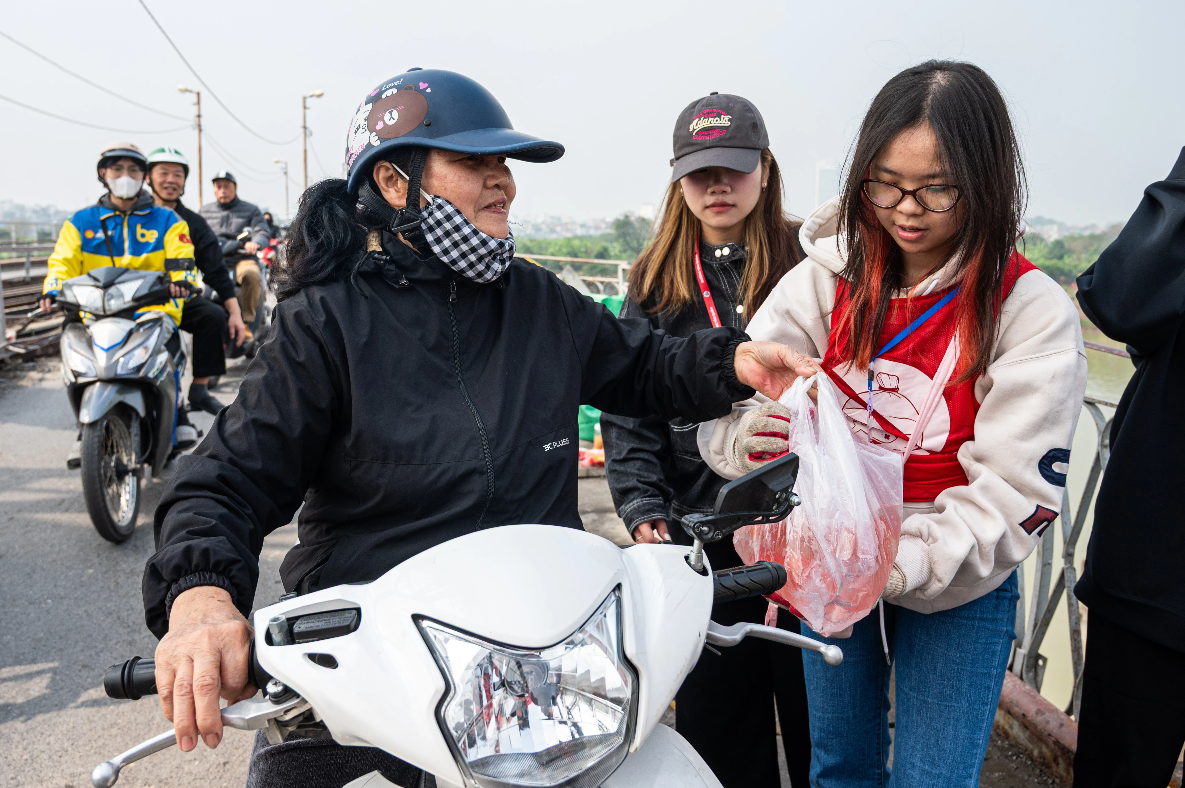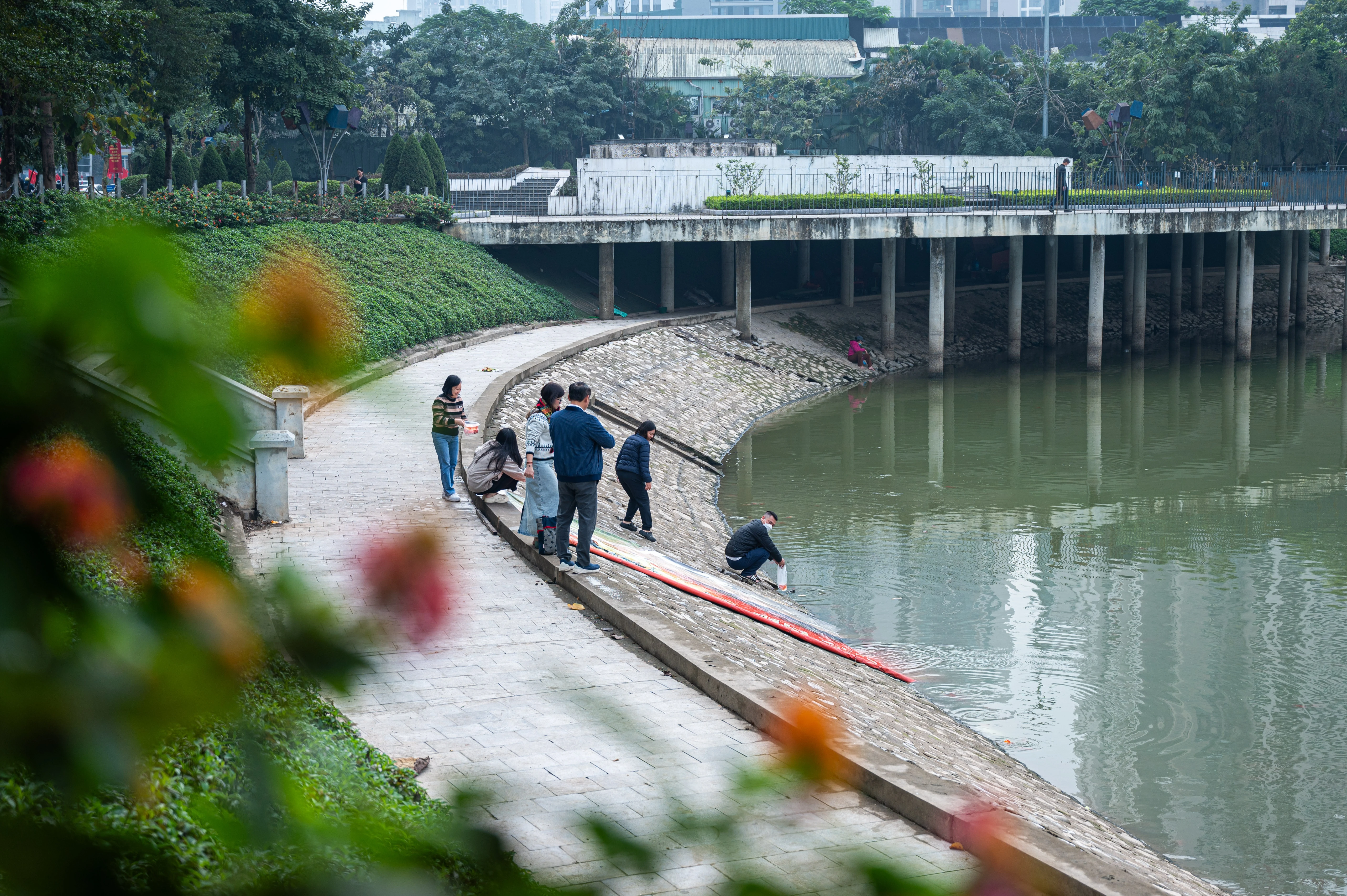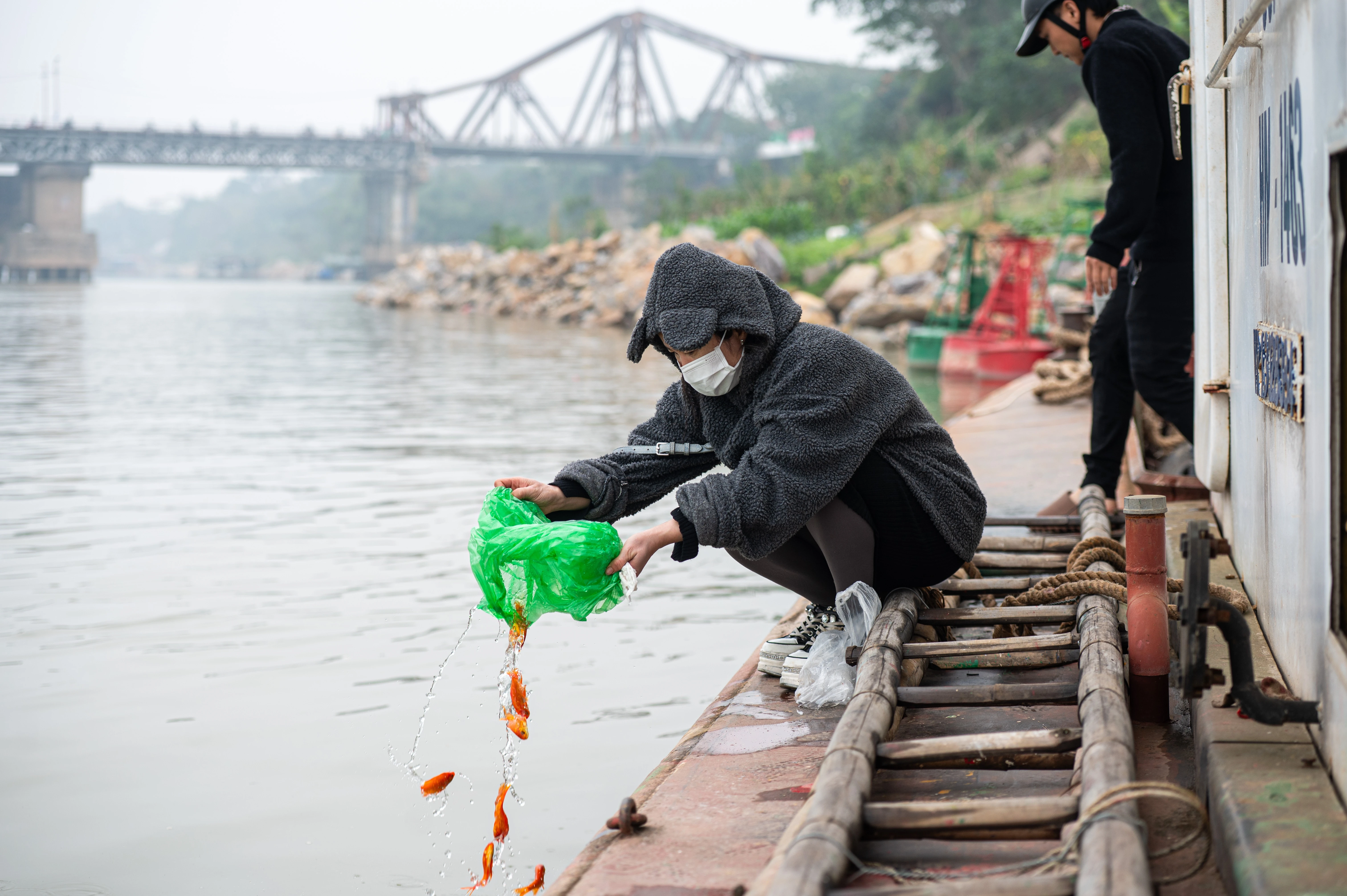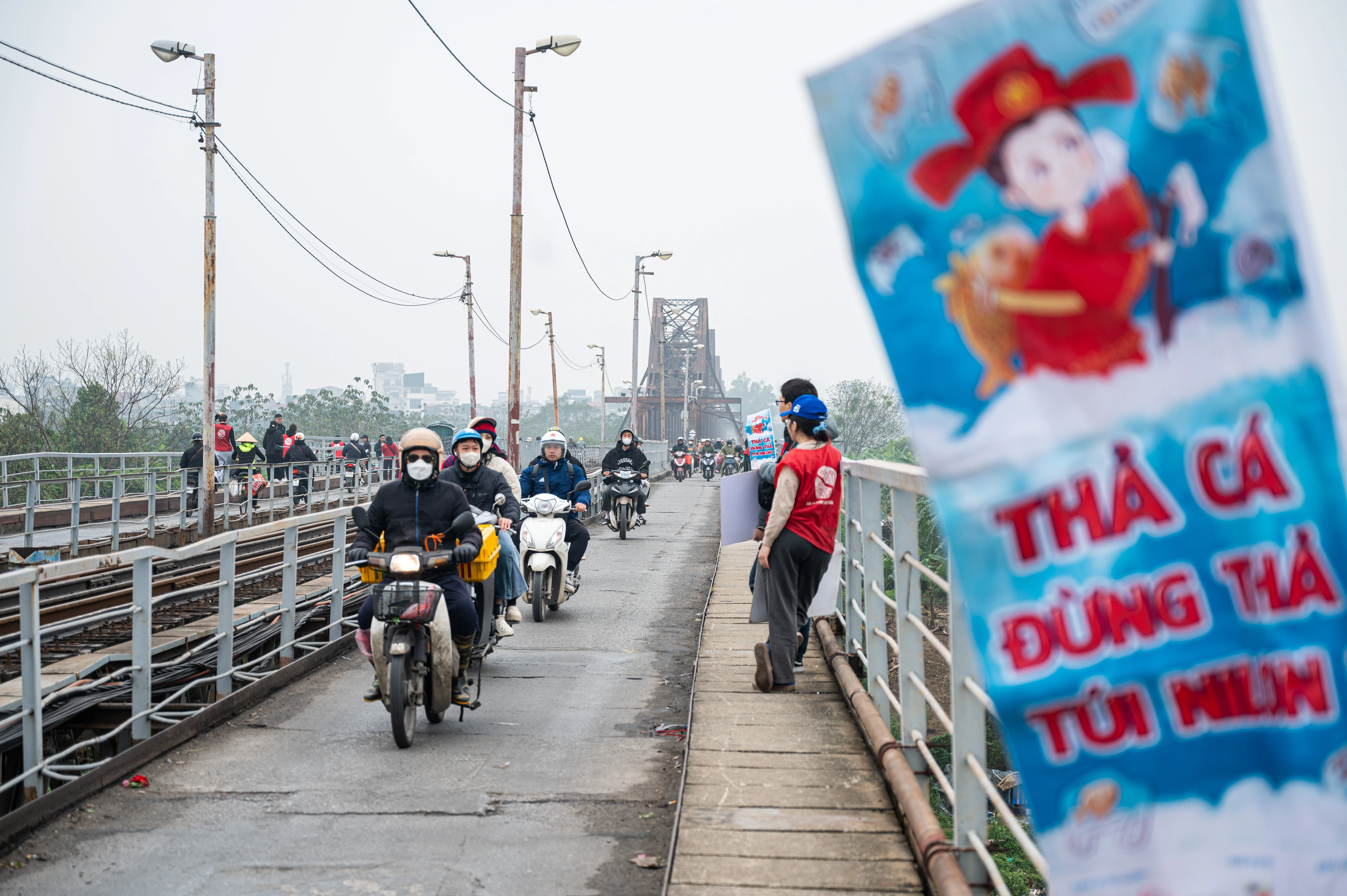 Dọc cầu Long Biên, người dân được các bạn tình nguyện viên hỗ trơ thả cá từ trên cao và dọn dẹp túi nhựa, rác thải.