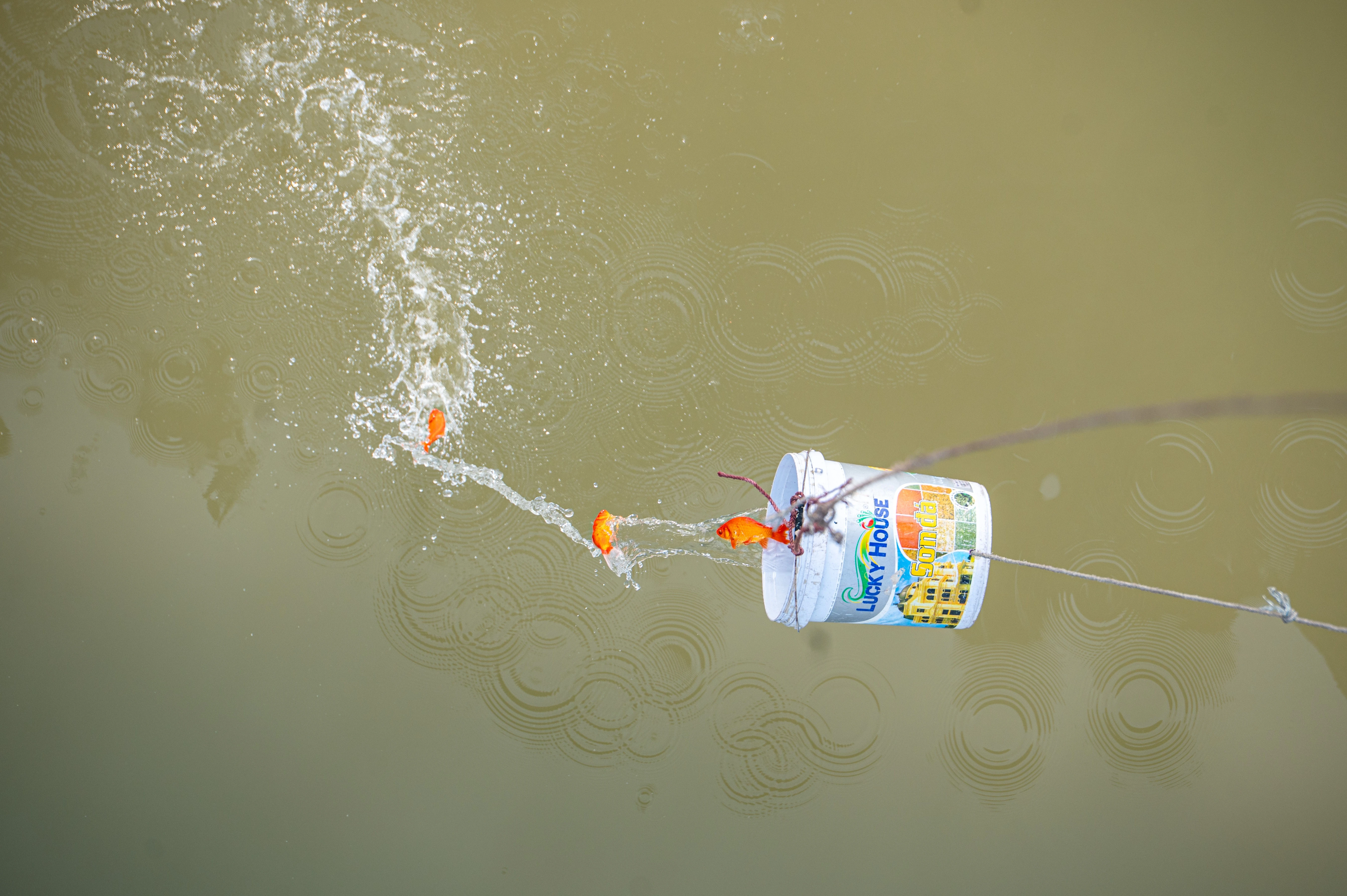 Cá chép vàng được các tình nguyện viên đưa vào thùng, sau đó thả từ từ xuống sát mép nước để cá được phóng sinh an toàn.