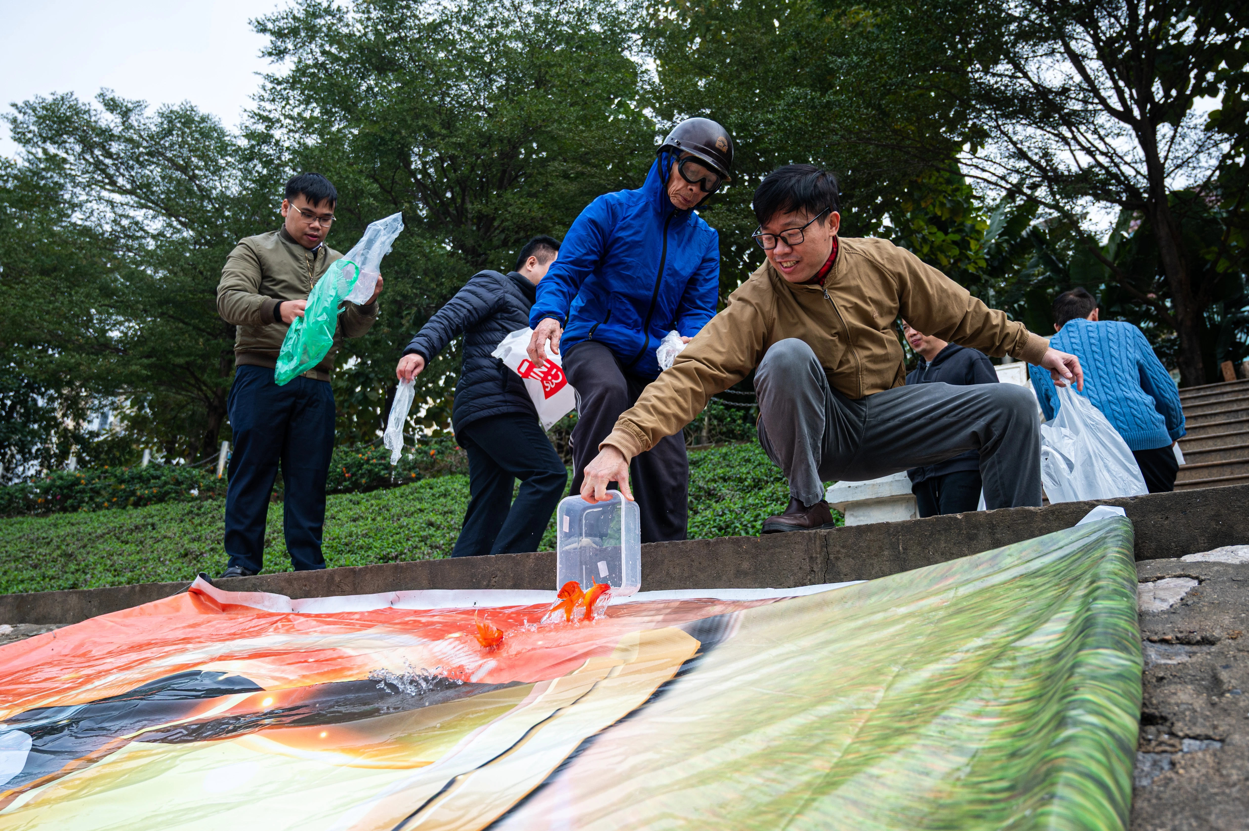 Không ít người mang theo xô, chậu cá từ sáng sớm, thành kính thả cá với mong muốn gửi gắm ước nguyện một năm mới bình an, may mắn.