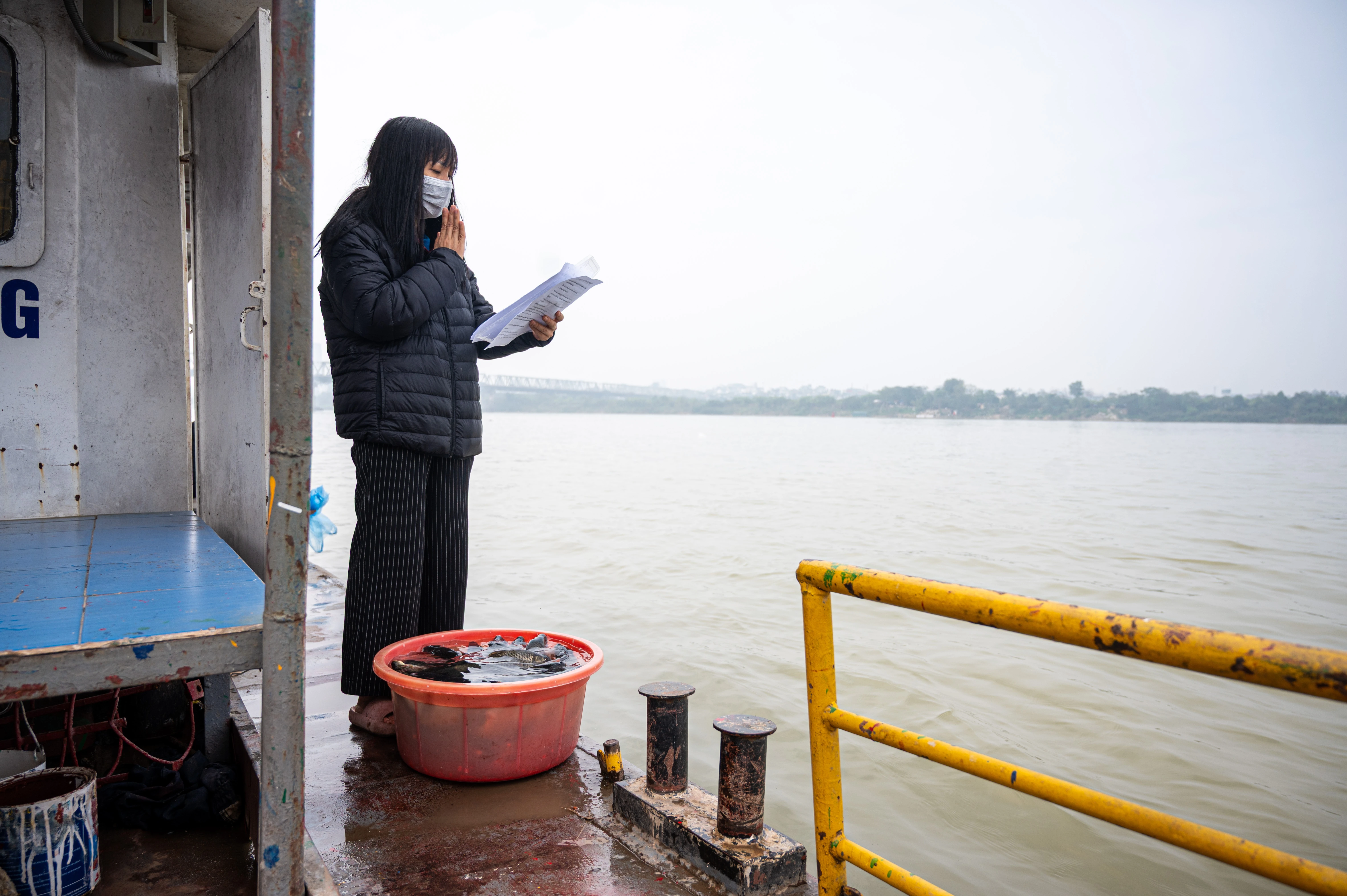Vừa phóng sinh cá chép, người dân vừa đọc văn khấn cầu chúc cho năm mới tốt lành.