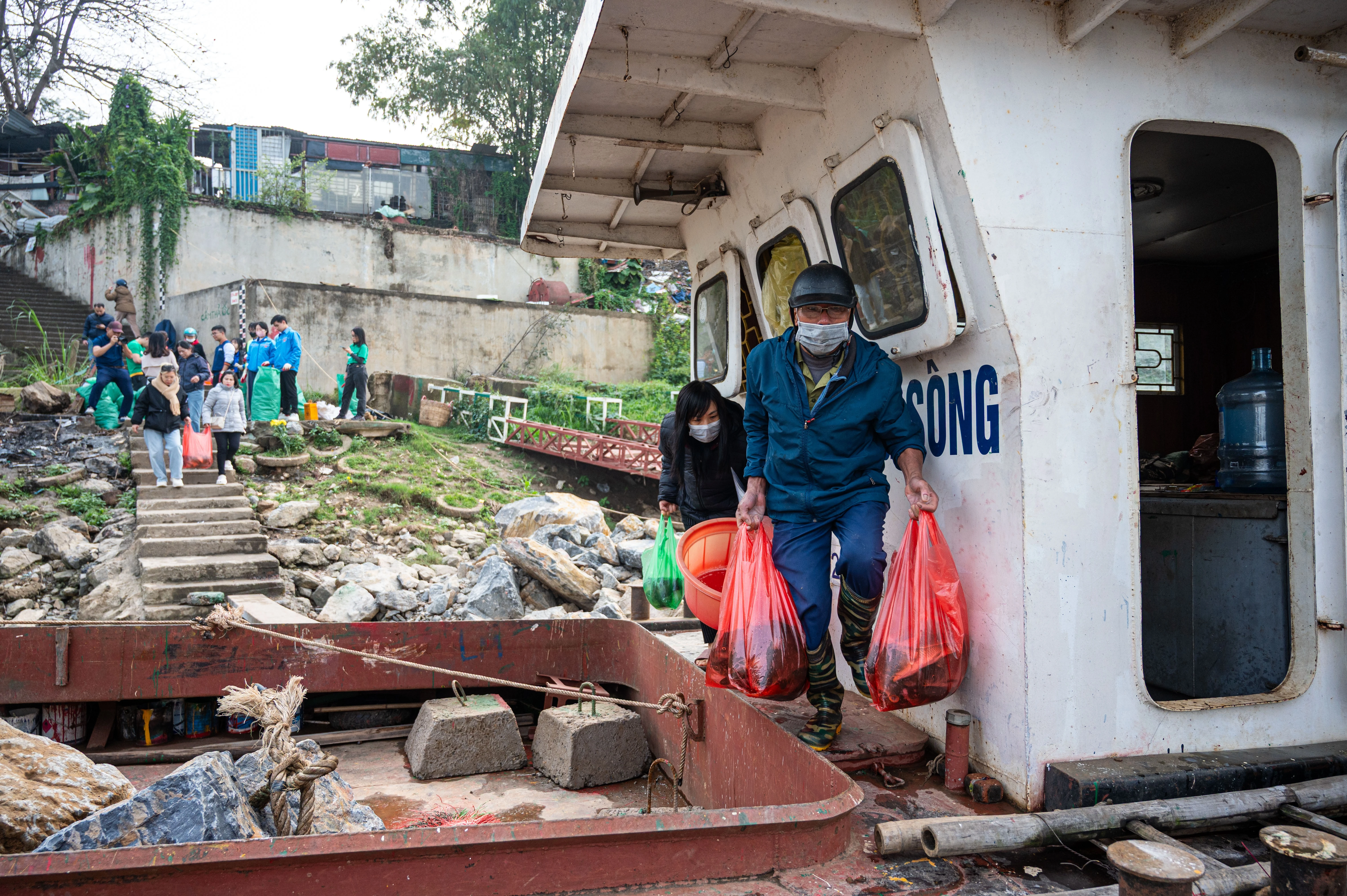 Người dân trèo lên các tàu thuyền neo đậu tại bến đò để thả cá. Có người mang hẳn chậu cá chép với số lượng khoảng 20 con để phóng sinh.