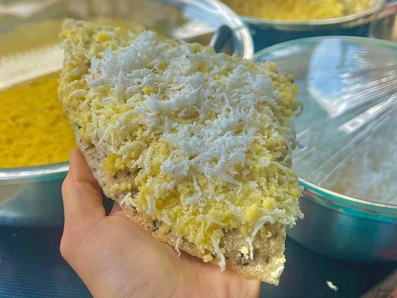 Sau đó, quết lớp chè kê, lớp đậu xanh cùng một ít dừa nạo và rắc thêm một ít đường lên bánh đa nướng.