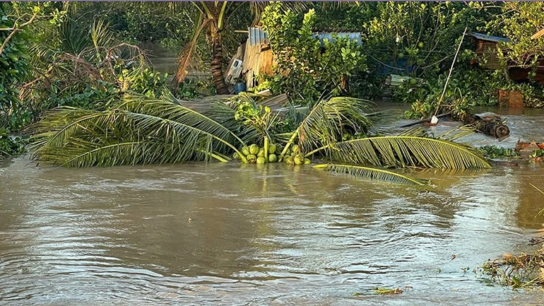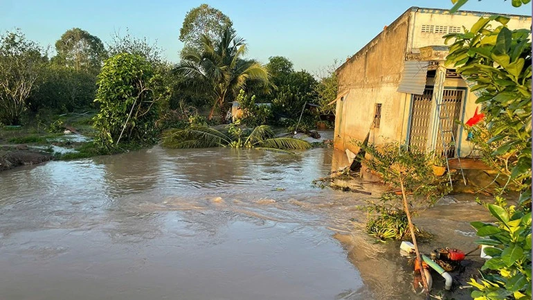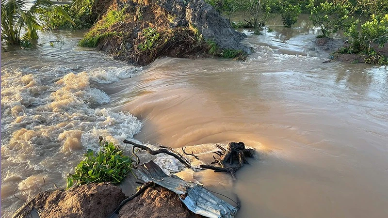 Một đoạn đê bao dài 100m thuộc bờ sông Cổ Chiên (Vĩnh Long) bị sạt lở, ảnh hưởng 50 hộ dân và 55ha vườn cây ăn trái.