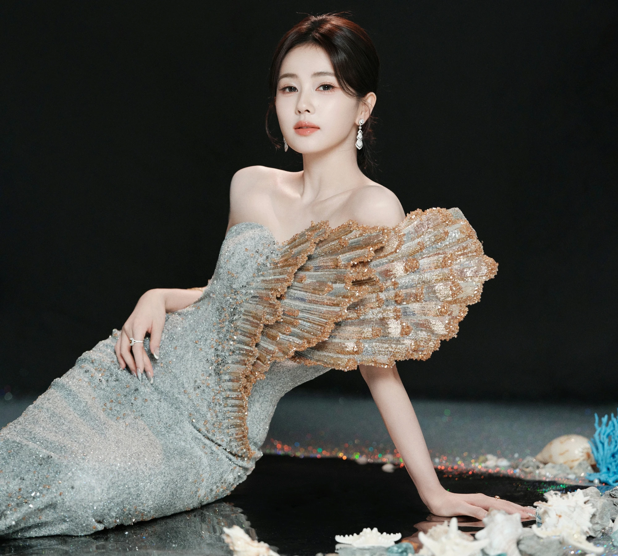 Bạch Lộc bước lên thảm đỏ với bộ váy sequin xanh đậm của Alexis Mabille, kết hợp cùng trang sức cao cấp De Beers. Sau đó, nữ diễn viên như biến thành nữ thần biển cả với bộ váy Haute Couture Xuân Hè 2026 mới nhất của thương hiệu Rahul Mishra. Cả hai bộ váy đều giúp Bạch Lộc tôn lên làn da trắng sứ, vóc dáng thon thả cùng thần thái rạng rỡ.