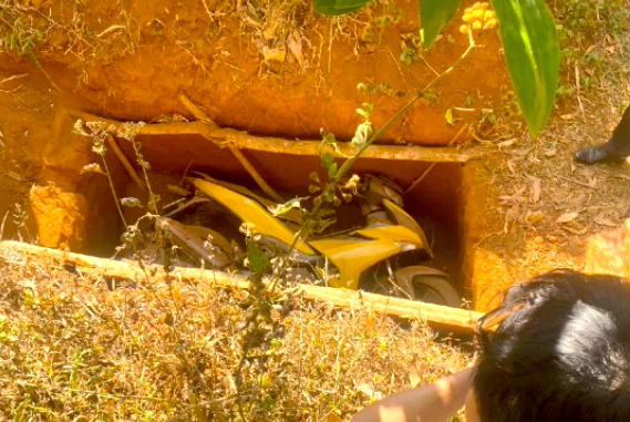 Chiếc xe máy nằm dưới hố sâu khoảng 1m, dài tầm 1,5m, phía trên được che lấp lại bằng tấm bạt xanh da trời. Cách nơi chôn giấu xe máy khoảng 200m có một vị trí bị đốt cháy nghi do các đối tượng đã đốt tiêu hủy áo quần và một số trang bị dùng thực hiện vụ cướp.