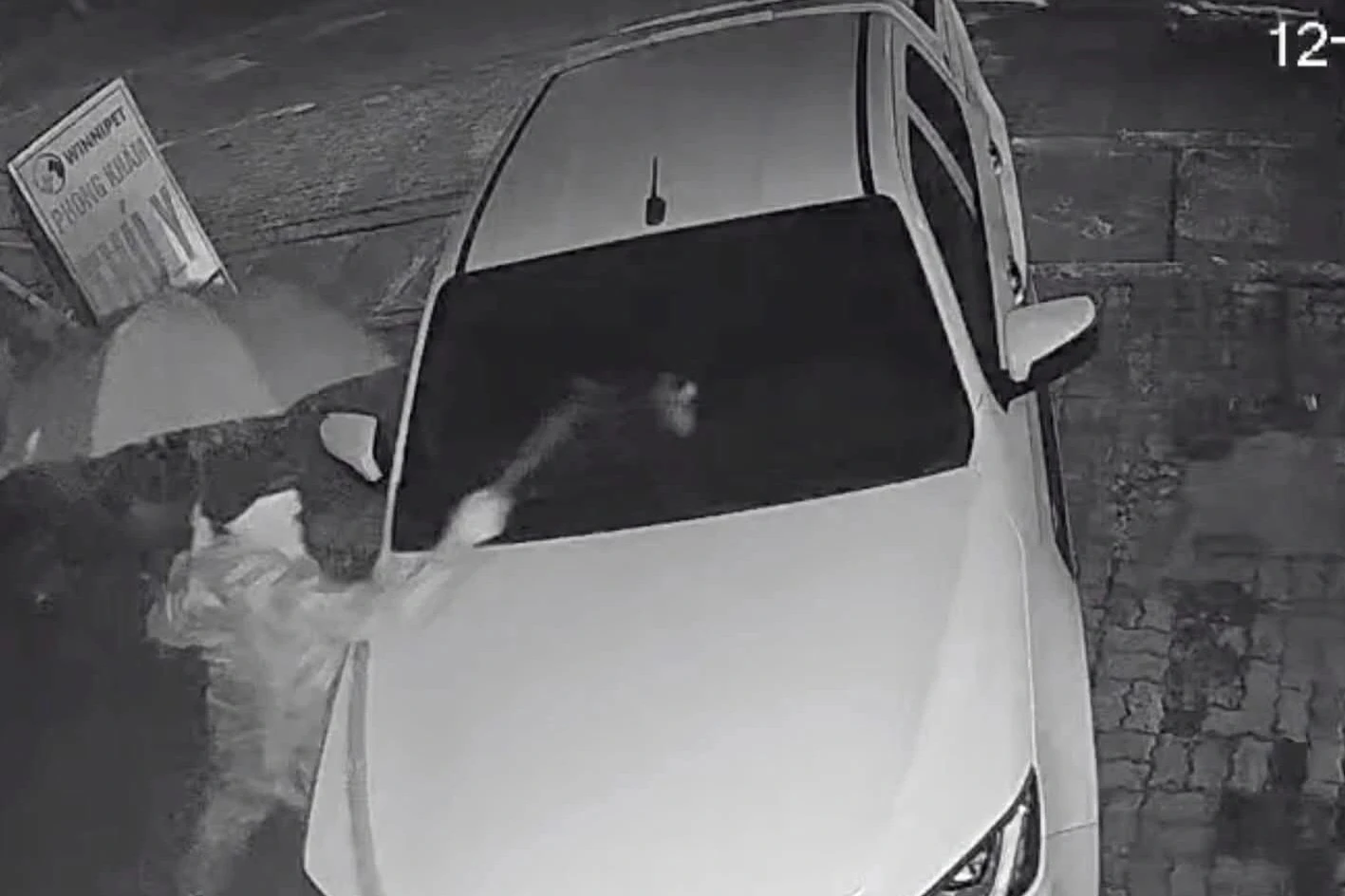 Camera an ninh trước nhà anh C. ghi lại, khoảng 5h40 cùng ngày, một người đàn ông cầm ô che đầu, mặt, đi đến vị trí ô tô, dùng vật cứng liên tiếp đập mạnh vào kính lái và 2 đèn xe. Hậu quả, chiếc xe bị nứt vỡ kính lái và hỏng toàn bộ cụm đèn phía trước.