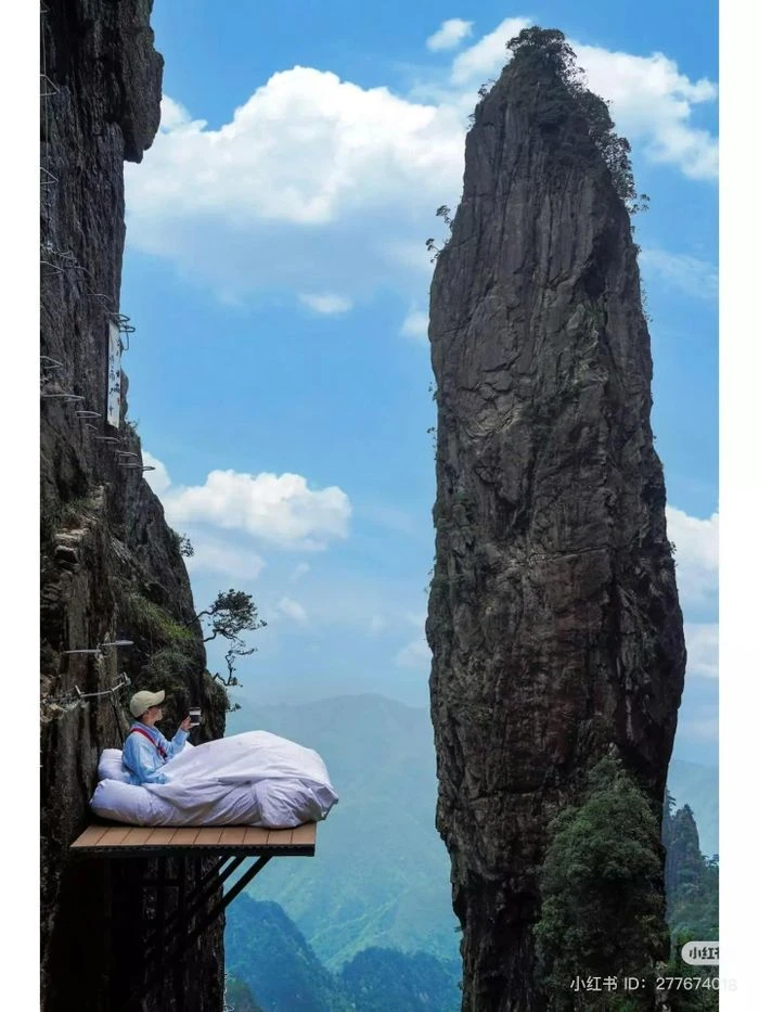 Du khách uống cà phê trên chiếc giường cheo leo giữa vách núi. Ảnh: Sohu.